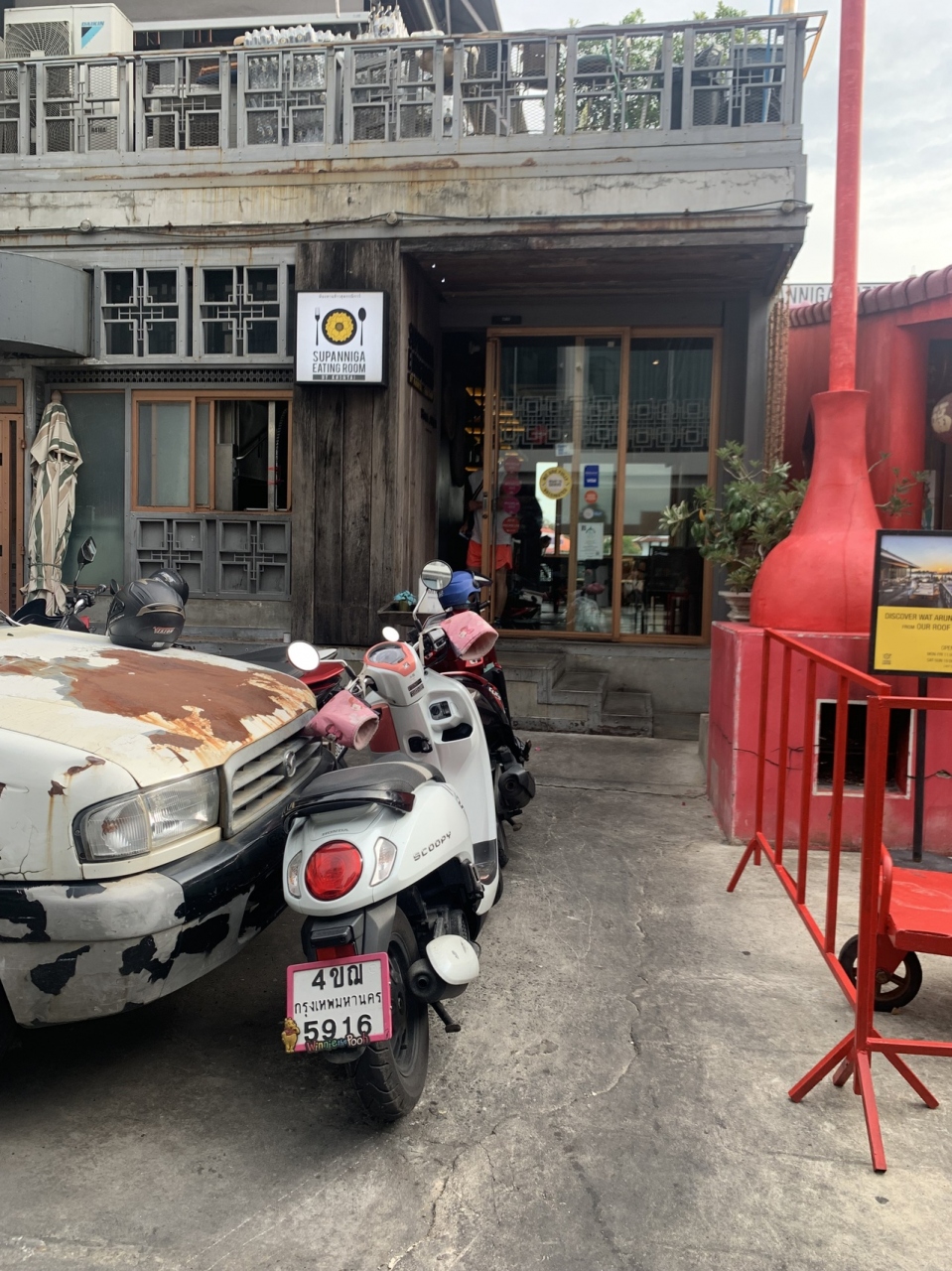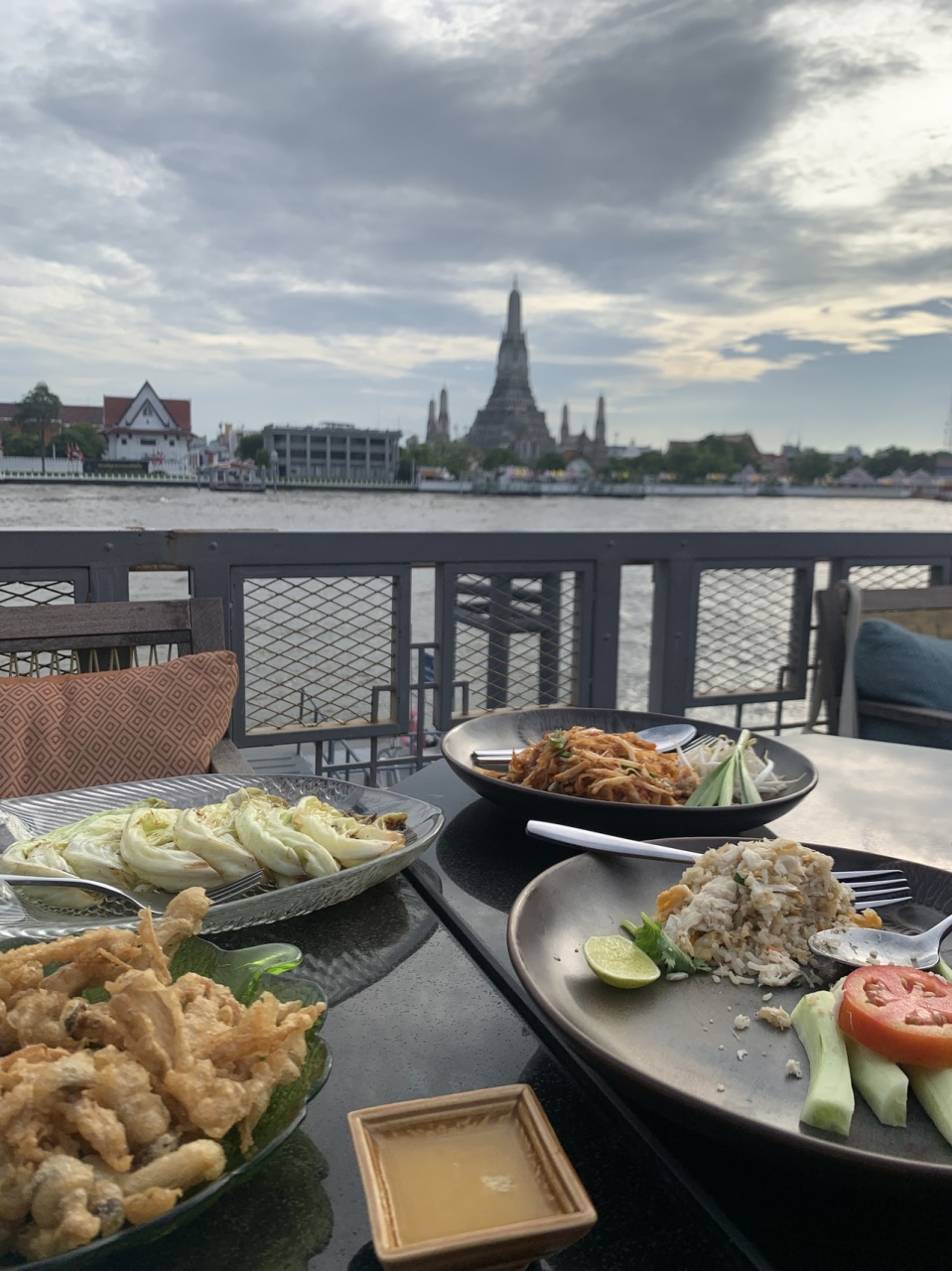 チャオプラヤ川沿いのワットアルンを眺めながら食事のできるお店で、雰囲気も料理も良かったです。夕暮れから日没後のライトアップが見れる時間がオススメ!ワットポーからも歩いてすぐの場所で観光客も多く、2階のオープンデッキは予約した方がよさそうです。お店のホームページから予約できました。MRTの駅も近くにあるのでアクセスも良かったです。