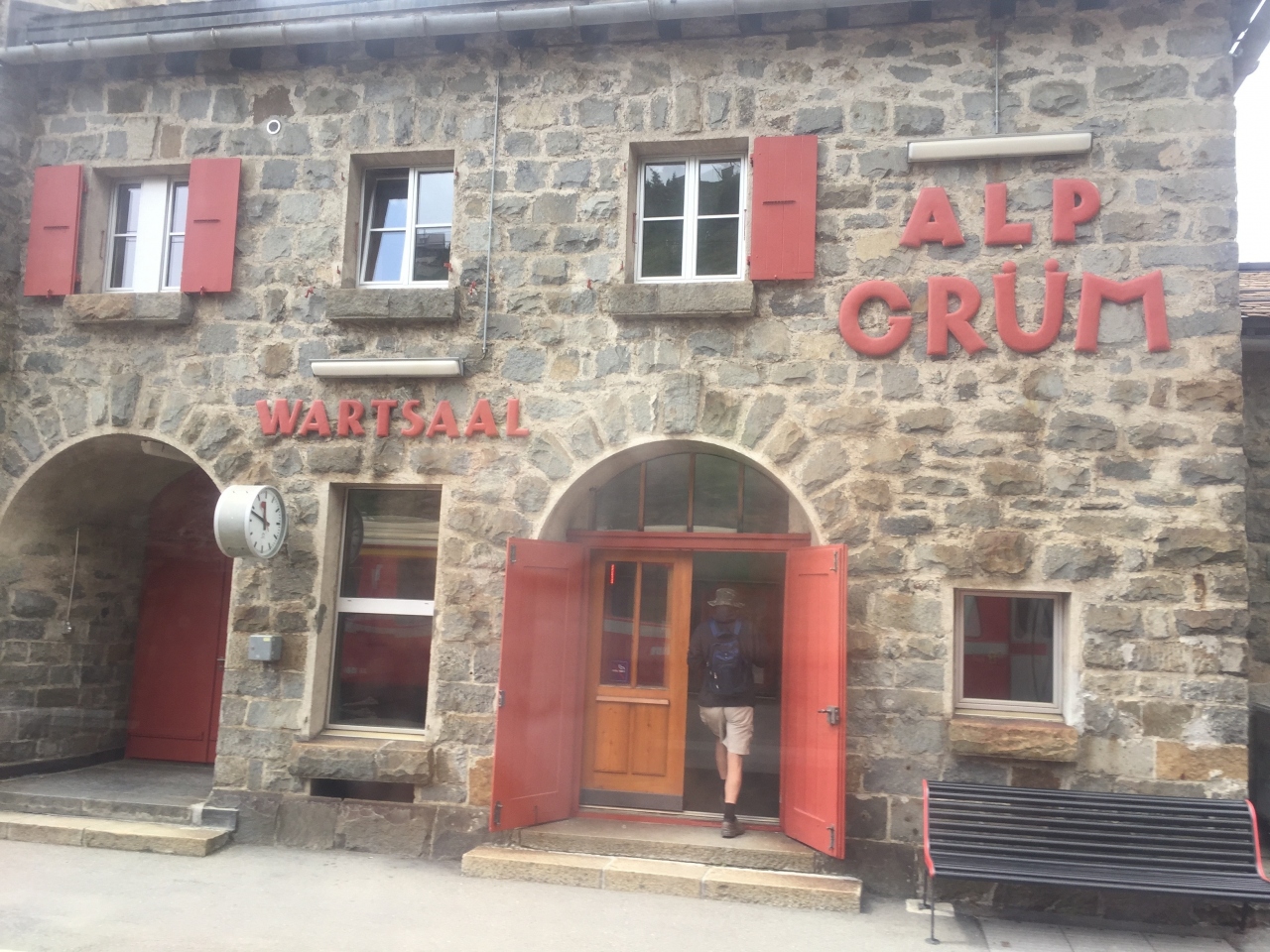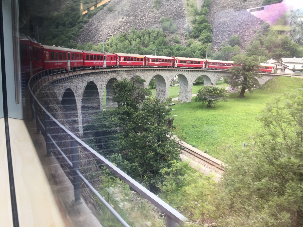 アルプグリュムあたりのトレッキングを予定していましが、ガスっているのでパスしてティラーノまで行ってしまうことにしました。列車の後ろに自転車専用車両が付いていました。アルプグリュムを過ぎると自転車は全員降りたのでその車両に移動しました。自転車がない時は折り畳み式座席を利用できます。貸切状態の車両でループ橋を独占できました。