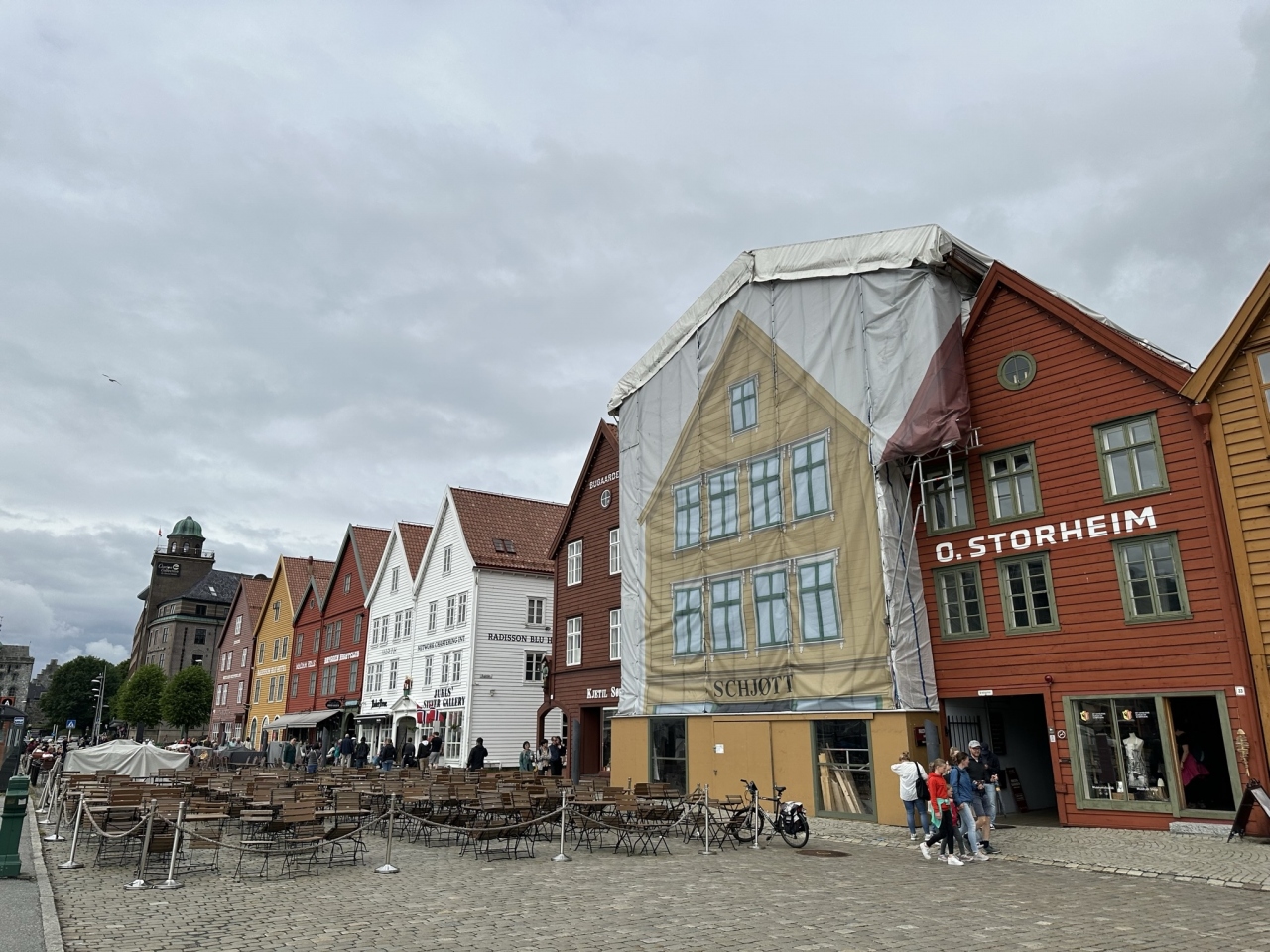 ベルゲンのウォーターフロント地区、魚市場に隣接する場所に、世界遺産に指定されている木造の倉庫群、ブリッゲンがあります。海側から見ると10軒ほどの三角屋根の建物がくっついて、お互いを支え合うように並んでいます。ハンザ同盟時代に建てられた木造の建屋を補修しながら、現在も美しい外観を保っています。約半数の建物が補修工事中で、木材で補強工事をしている様子なども見られました。