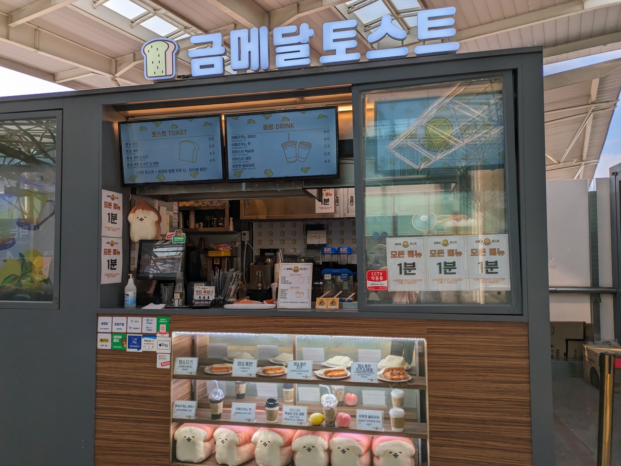 キンパやマンドゥ、トーストなど韓国ならではの売店がたくさんあって出発前からわくわくします。ガラス張りの開放感のある建物も素敵です。