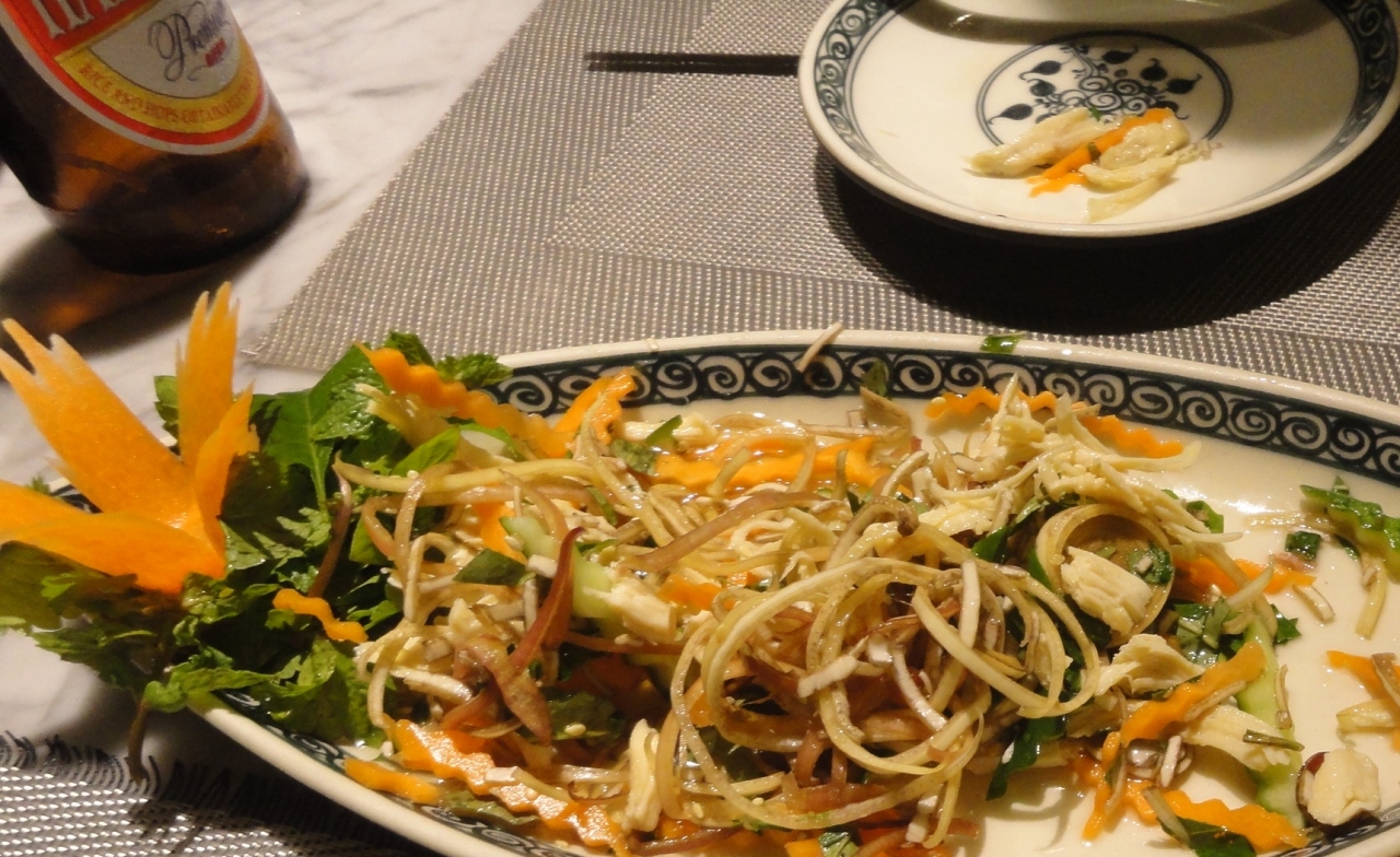 大理石のテーブルとシックな色合いのインテリアでしたが、バルコニーは外の喧騒が聞こえてきて、カジュアルな雰囲気でもありました。ビールとサラダを注文しましたが、サラダは予想外にボリュームがあり、東南アジアらしい味付けでとても美味しかったです。