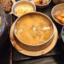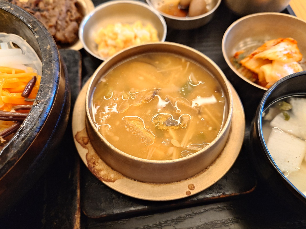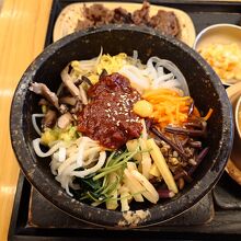 明洞のロッテ百貨店ソウル本店13階のレストラン街にあるビビンバのお店。家族会館は、ビビンバ発祥の地、全州の有名店。本場では石焼よりも普通のビビンバが好まれるようですが、こちらでは石焼よビビンバのメニューも豊富。少々お高いですが、セットメニューがオススメとのことで、一番人気の「佳縁牛肉セット」をオーダー。運ばれてきたビビンバは、彩りがよくきれい。ほうれん草、きゅうり、椎茸、エノキ、銀杏などに加えて牛肉、コツジャンが乗ったビビンバをよく混ぜると、辛すぎず、それぞれがバランス良く絡まって美味。おかずの牛肉は、これぞ韓国風の味付けですが、ちょうど良い甘さ。鶉の卵、水キムチなども、箸休めにちょうど良く、バランスが取れています。熱々のチゲ(味噌汁)も具材が豊富で美味しかったです。