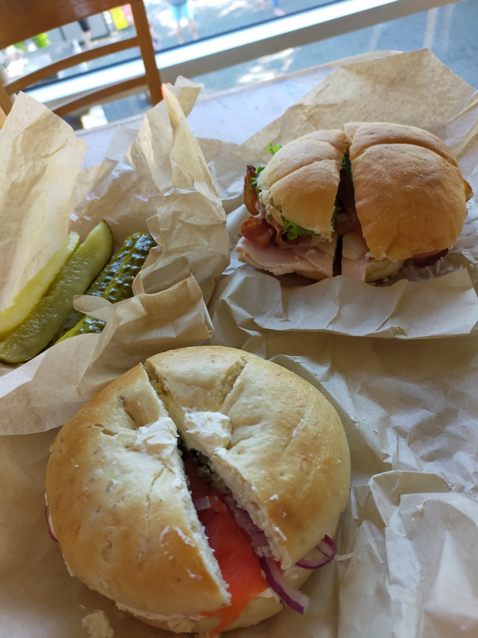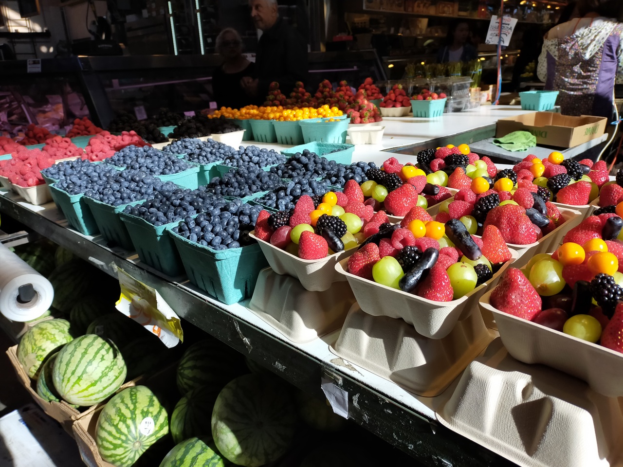 ウォーターフロントから50番のバスで行きました。マーケットの中は果物、野菜、パン、チーズ、ワインの店等入っていて、テイクアウトして食べるスペースもあります。外では大道芸人やアクアバスが行き来していて、見ているだけでも楽しいです。