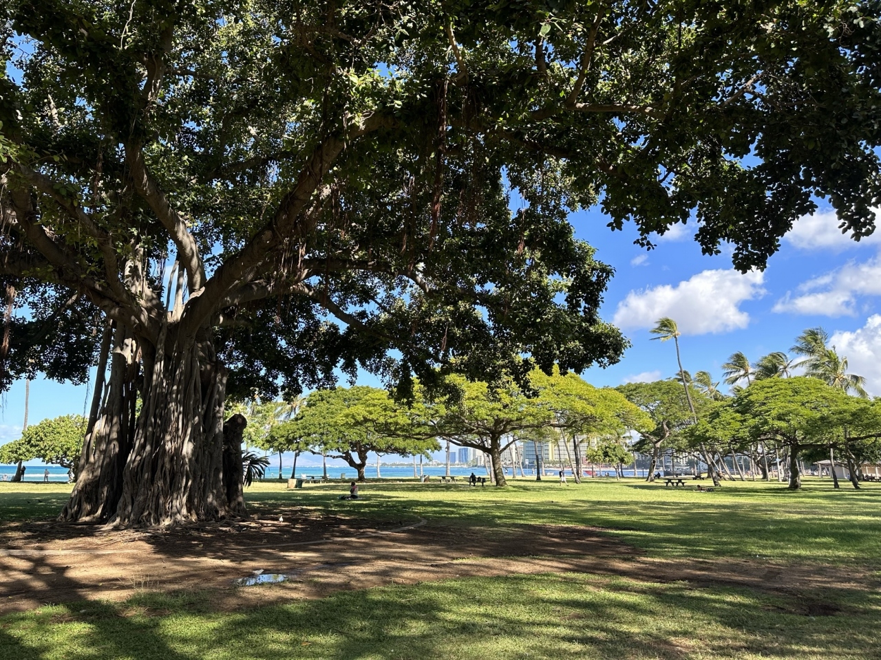 カピオラニ公園の目の前、ワイキキビーチの南の端にあるるビーチが、カピオラニパークビーチ。ビーチの南側にはホノルル水族館があります。