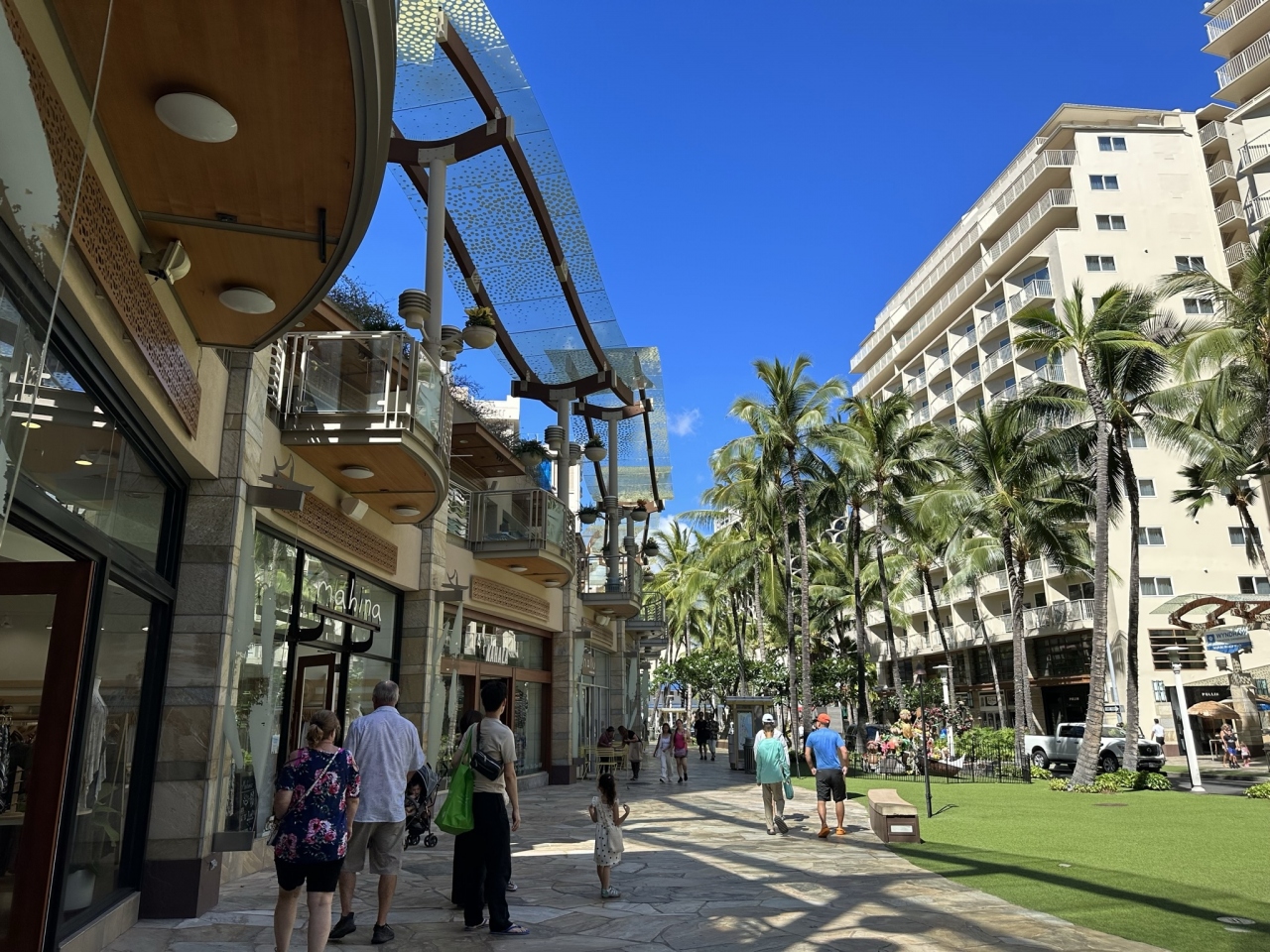 ロイヤルハワイアンセンターの北西側(アラモアナセンター側)にある2階建ての複合施設がワイキキビーチウォークで、2007年に開発されたものです。ハワイらしいショップやレストランなどが集まっています。建物の前にあるヤシの木で囲まれた芝生広場は特に開放的な腑に気になっていて、夜遅くまで大勢の人でにぎわい、ハワイを感じられる空間になっています。