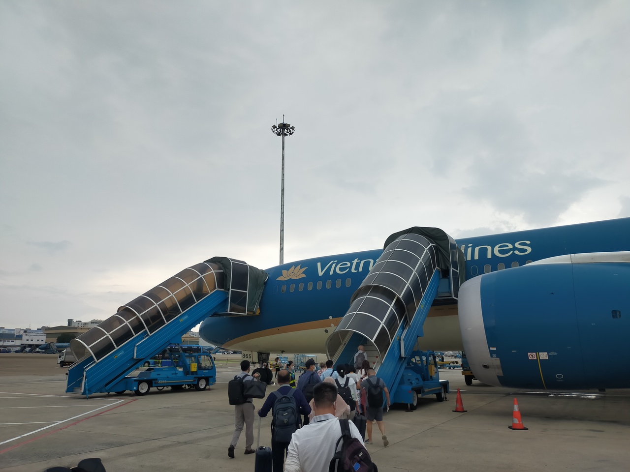 ハノイノイバイ国際空港とは異なり、国際線ターミナルと国内線ターミナルは徒歩で連絡可能なので、乗り継ぎするならハノイよりもホ一チミン経由がおすすめです。ただし、搭乗口が不足しているのか、国際線到着時も国内線出発時もバス搭乗となり、ベトナム航空どおしの乗り継ぎでも2時間でギリギリでした。
