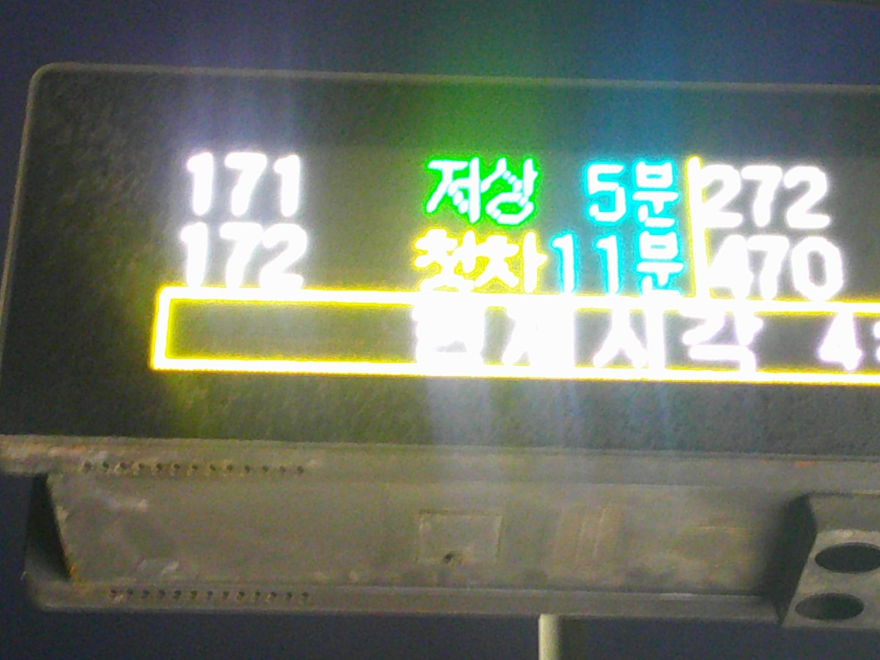 今回は、ソウル首都圏の交通機関で適用される早朝割引(6時半まで20%引き)を利用しようと、午前4時台にバス停に向かいました。前日の下調べで、乗りたかったバスの始発時間が4時から、となっていたので、4時50分位ならもう運行しているだろうと最寄りバス停に到達したのですが、何と、そこでの電光表示を見ると、始発までまだ40分位先、とのことで、結局そんなに待ってもいられないので、もう少し早く来る別のバスに乗車してしまいました。