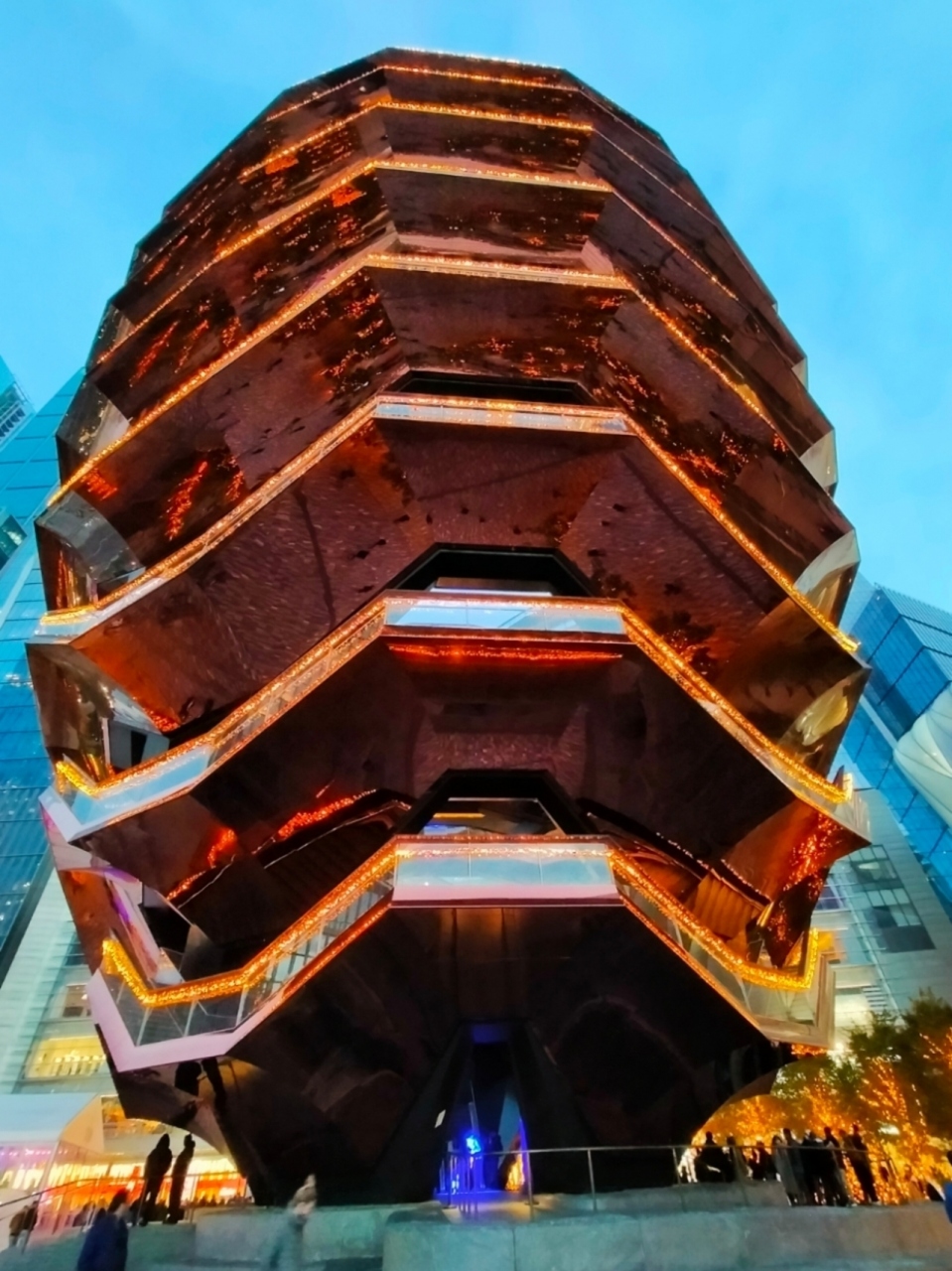 ハドソンヤーズにあるちょっと変わった建物です。一応展望台ではありますが、そこまで高さはないです。ホリデーシーズン仕様か、建物全体にライトが装飾されていて、夜になるとイルミネーションがきれいでした。ショッピングモールや周りの木々もホリデー仕様になっていて、この辺り全体華やかな雰囲気でした。