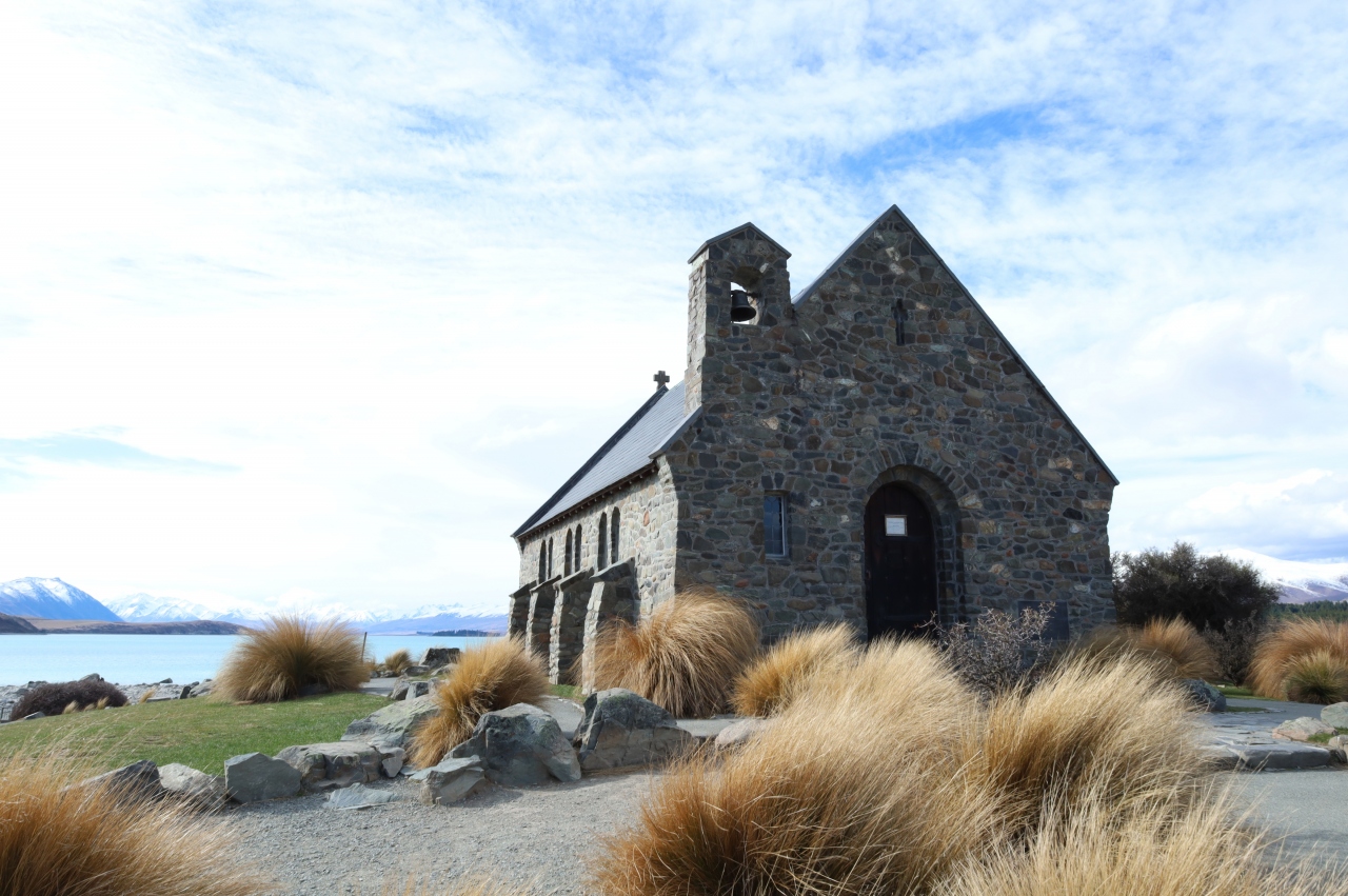 テカポ湖といえばこちらの教会ですね。人気の観光名所なのでたくさんの人で賑わってました。石造り教会なのですが、建てる時にあえて昔ながらの方法で建設したそうです。街の雰囲気にもピッタリで絵になる教会でした。扉が開いている時は中に入れるそうです。