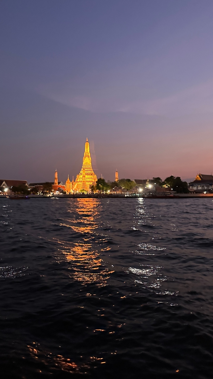 バンコクの大河チャオプラヤ。交通手段の船を利用して昼の時間帯に移動するのも、川沿いの観光ももちろんいいのですが、圧巻なのは夕方から夜。宵闇に向け徐々に日が暮れ、川向うの寺院が輝いている様はやはりバンコク観光のハイライトというべき時間です。