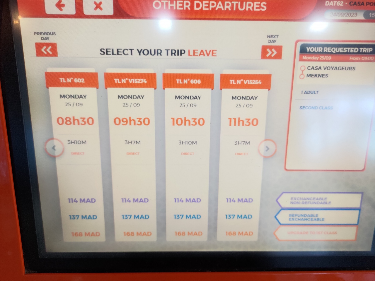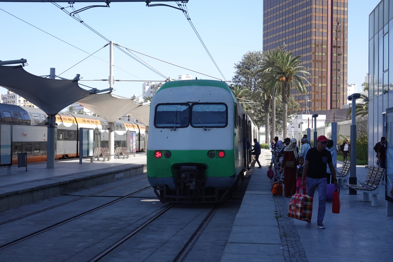 空港アクセス鉄道の発着駅です。空港行きは1時間に1本ですので、時間には注意が必要です。私は運悪く空港駅で1時間待ちました。2023年9月現在、空港~カサポールは2等で50DHでした。長距離列車の発着するカサボヤージャー駅よりも街の中心に近いので便利です。モロッコの駅はだいたい窓口に行列ができていますので、時間には余裕をもって到着した方が良いです。自動券売機も設置されていますが、日本発行のカードでは決済で弾かれて買えませんでした。