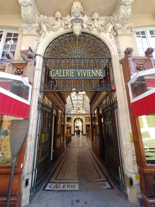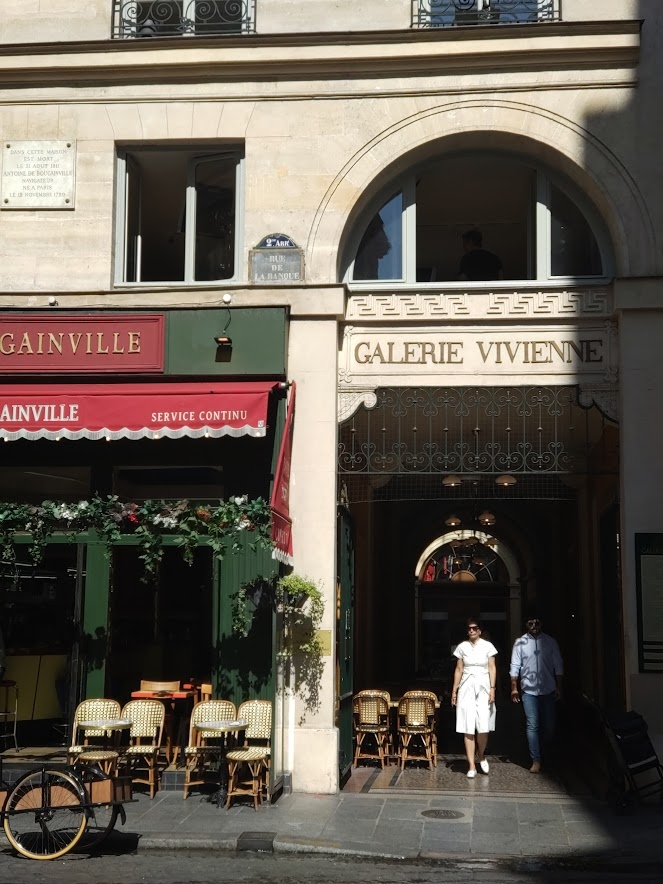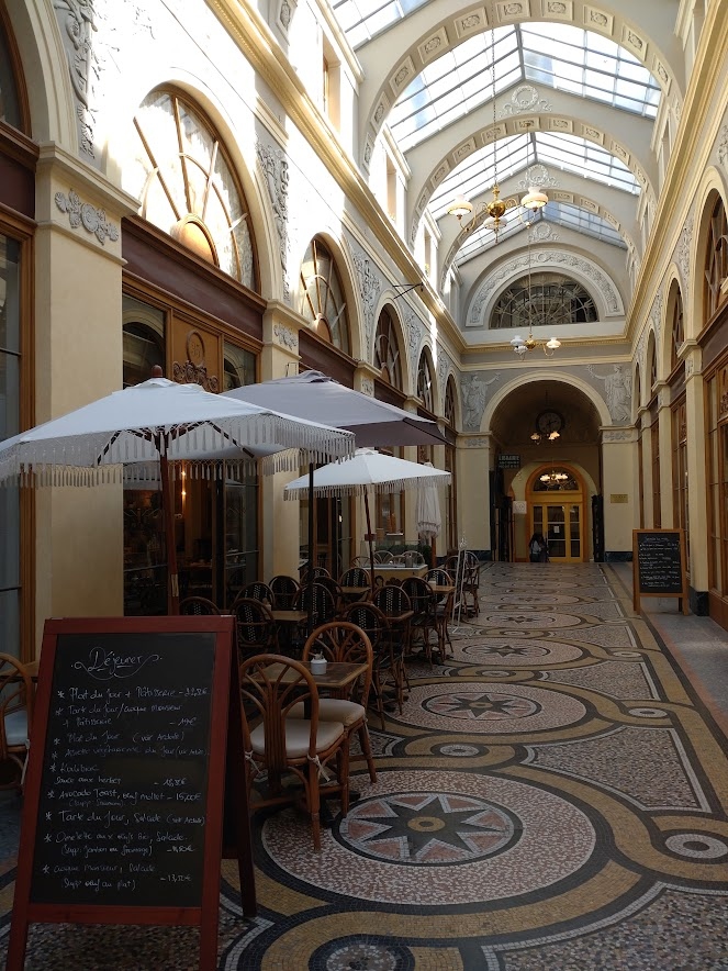 落ち着いた雰囲気の、おそらくパリで最も有名なパサージュです。店の前にテーブルが置かれた広めの通路もありました。完全にアウトドアのテラス席と違い、ここなら埃も騒音もなく、静かに食事やお茶を楽しめそうです。