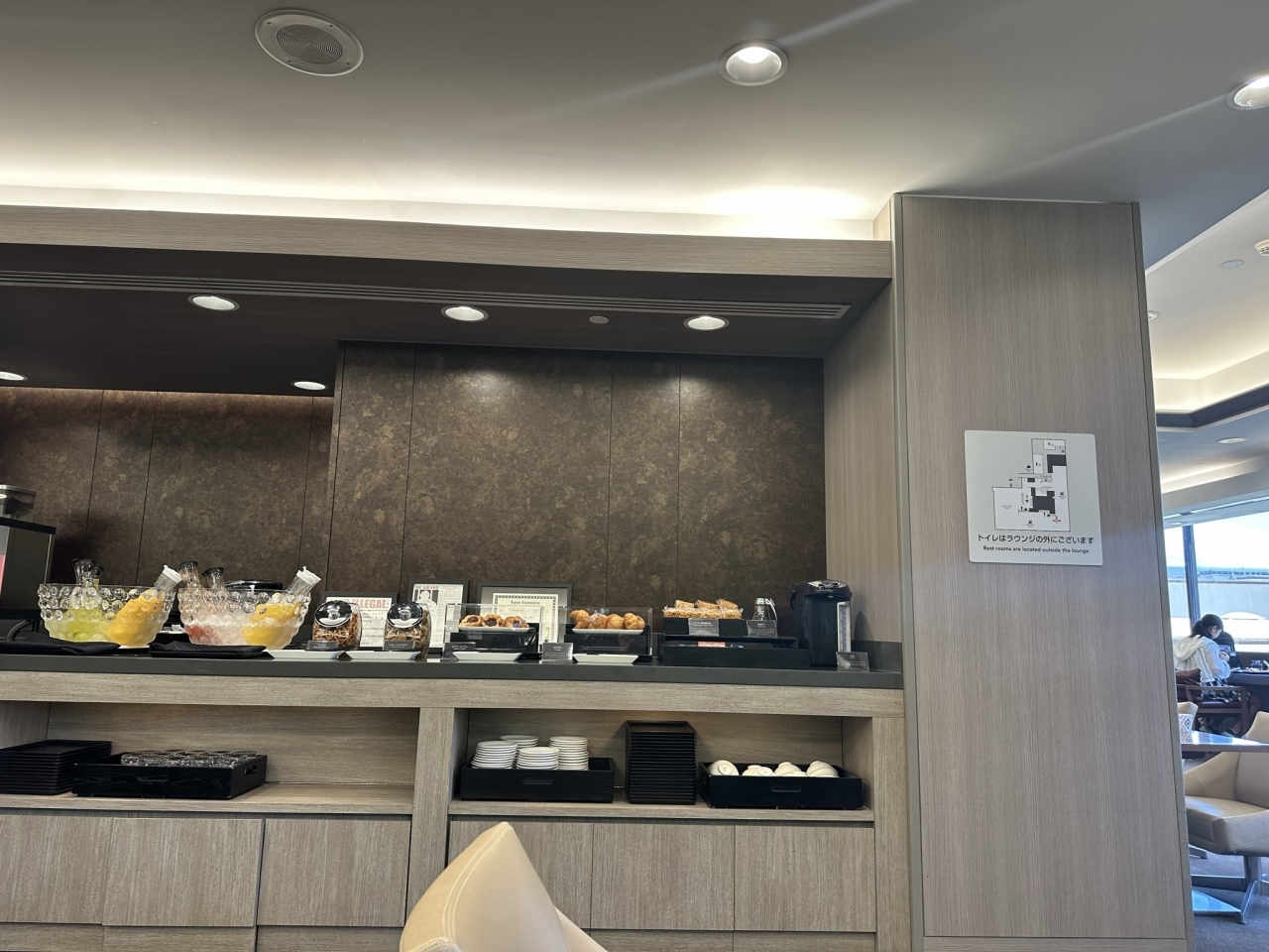 JALのエメラルド会員向けのラウンジはなく、サクララウンジだけがあります。ラウンジはあまり広くなく、お盆休みの時期が悪かったのかもしれませんが、満席で、関があくまでしばらく待ちました。軽食としてチキンラーメン(乾麺にお湯を入れるだけのもの)をいただきましたが、とても美味でした。