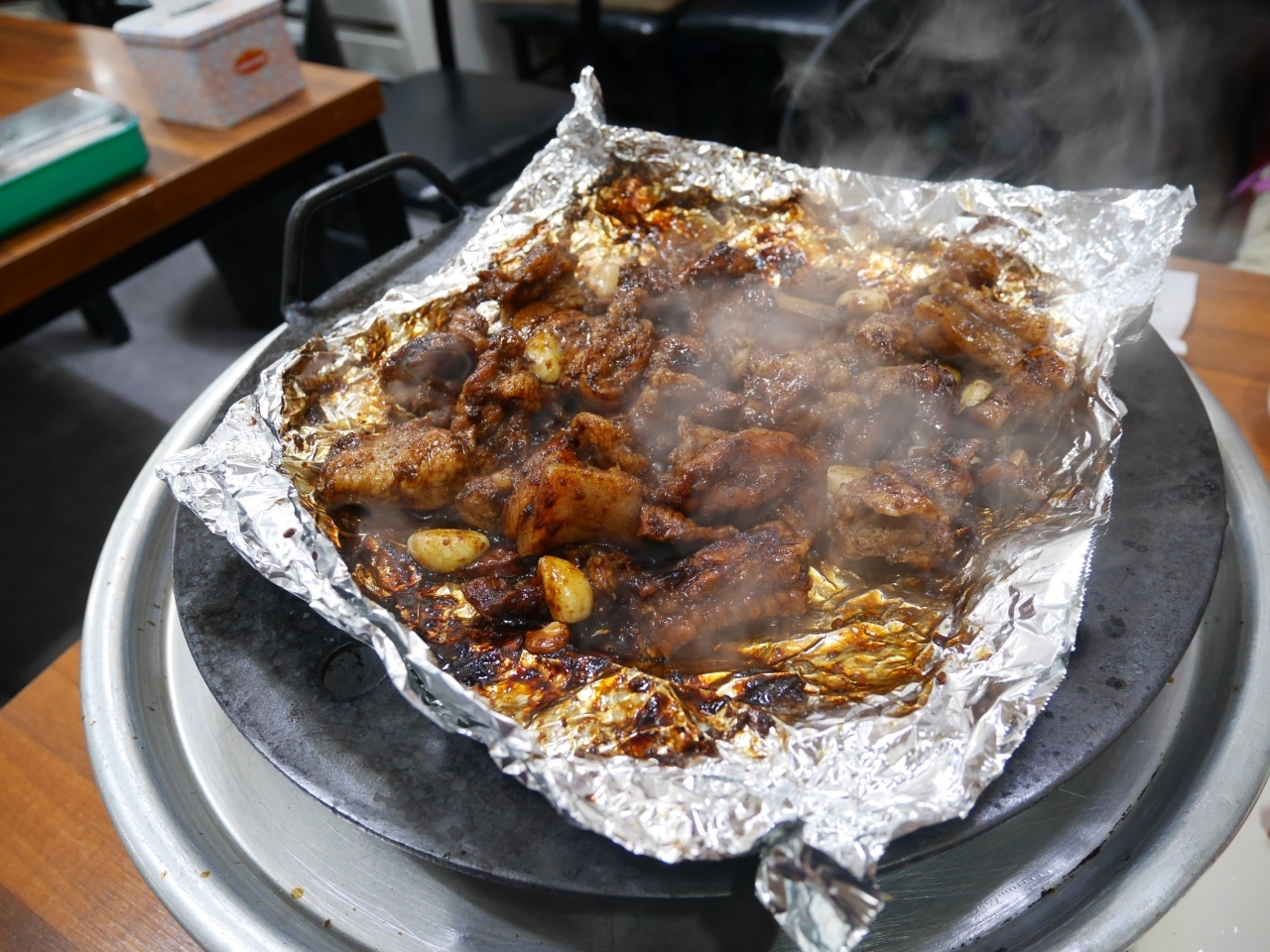 デジカルビの注文は3人前から。スタッフさんが豚肉をハサミで食べやすいサイズに切ってくれて、アルミホイルの鍋を直接火にかけて煮炒めていきます。