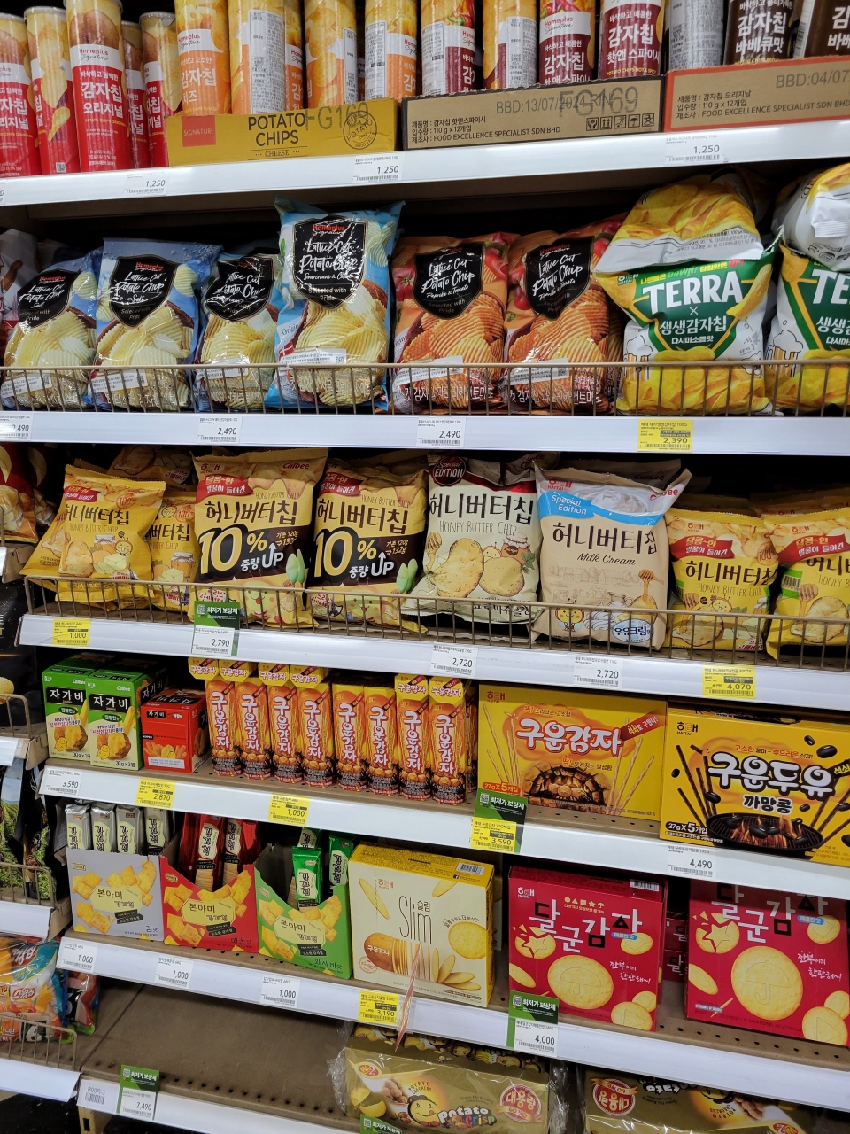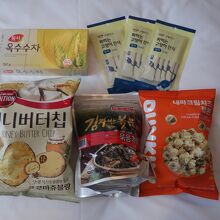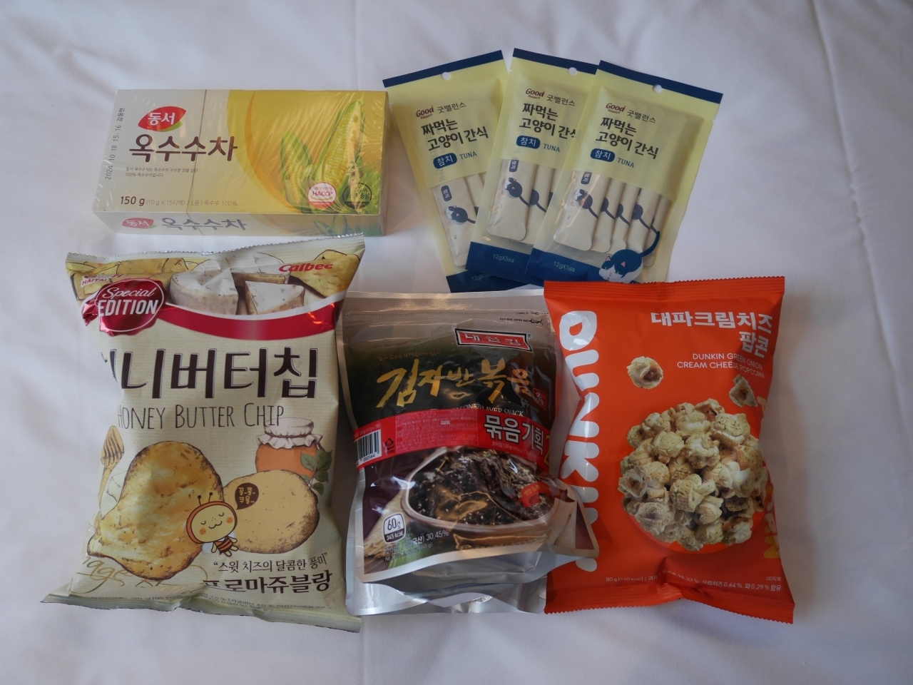 ハニーバターチップスなどのお菓子、海苔ふりかけとコーン茶、愛猫へのお土産で韓国製のチュールも買いました。