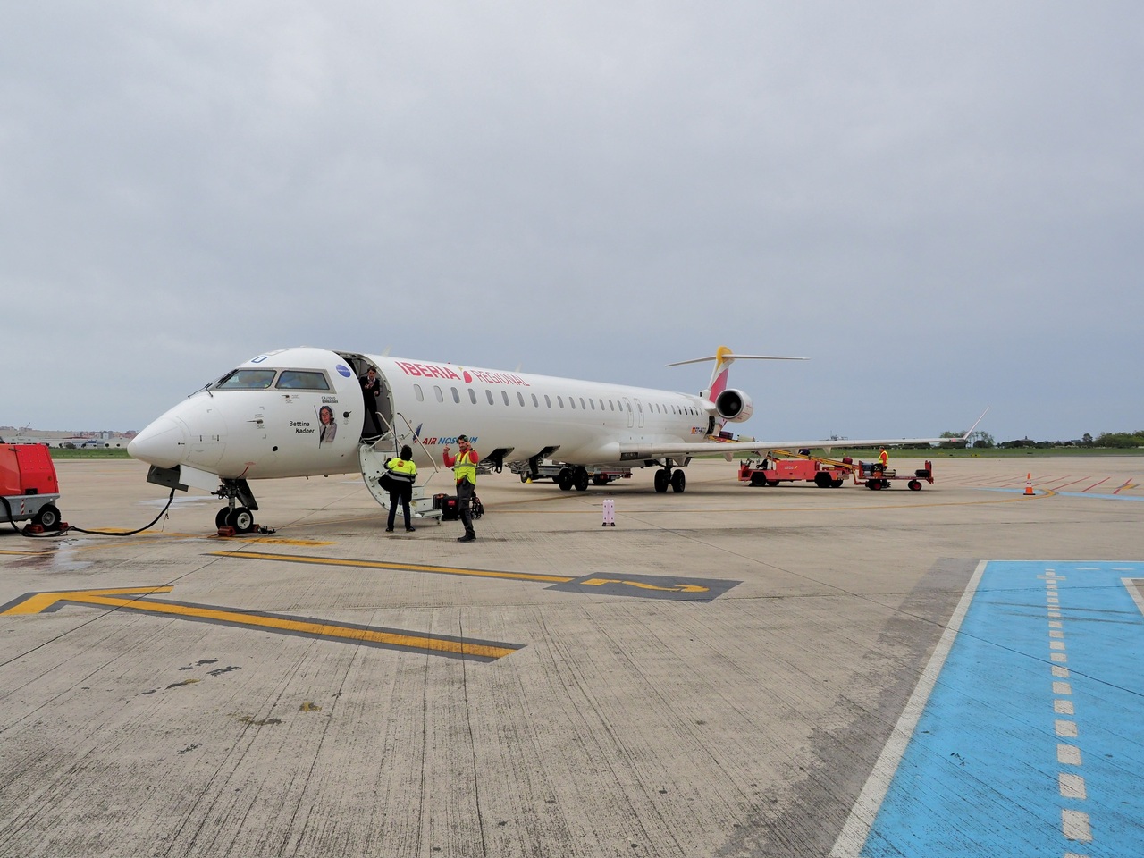マドリードからのイベリアグループ便を利用して到着しました。マドリードからは全便リージョナルジェットでの運行で一日3-4往復あります。ジェットブリッジはないので飛行機からターミナルまでは徒歩で移動するので飛行機を間近でみられるのは楽しいです。そのほかにブエリングやライアンエアなどがちらほら他の都市から運行しているようです。マドリードからだと飛行時間40分、サンタンデールアプローチ中にはカンタブリアの美しい自然も見ることができます。