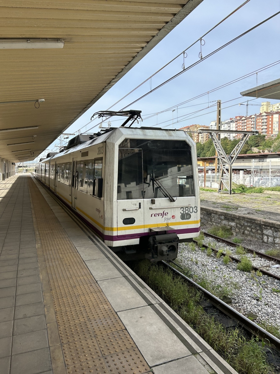RENFEの通常の列車が発着する駅舎がメインにあり、そこから海側に100mくらいいった場所にFEVEが発着する駅があります。電車でトレラベガまで行って、サンティリャーナデルマル行きのバスをトレラベガのバスターミナル(駅から10分ほど離れている)から乗るという利用をするときはFEVEになるので左側の駅から乗ることになります。ちなみにトレラベガまでは片道2.6ユーロ、RENFE&tuという切符を購入してICチップ入りの紙カードにチャージして乗ることになりますが、最初に買うときに0.5ユーロかかります。クレジットカードサイズの画用紙みたいな硬さの紙なので、使い捨てに見えますが捨てないでください。ちなみにここで買ったカードはビルバオでは使えませんでした。ビルバオはまた別のRENFE&tuが必要になります。