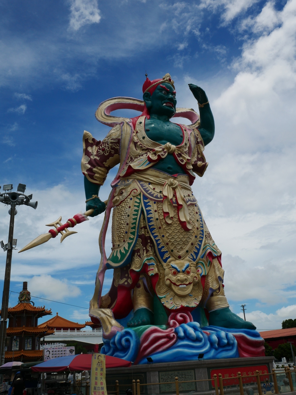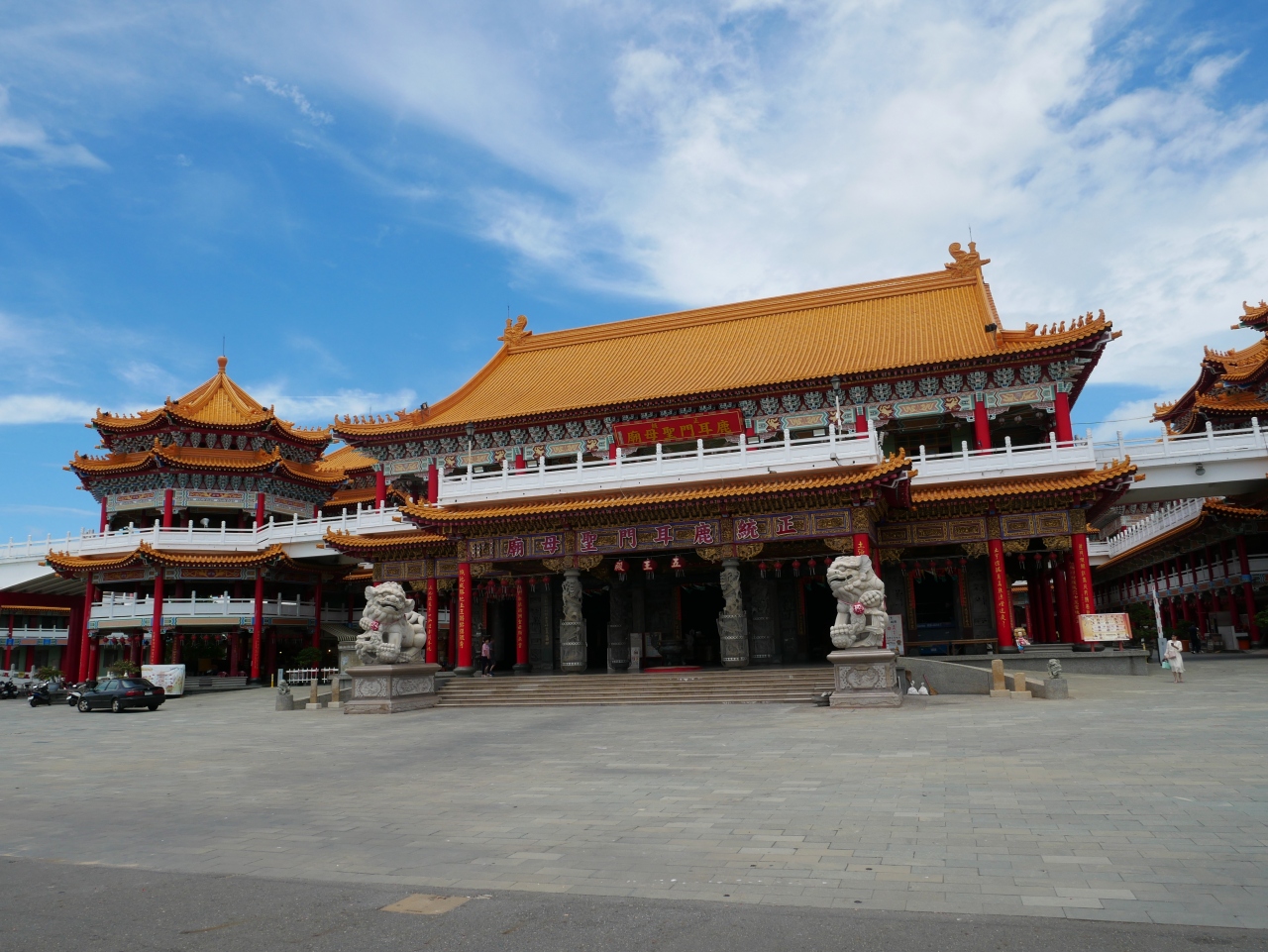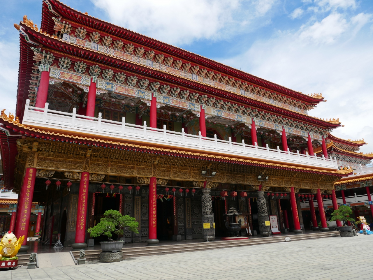 駐車場には2体の巨大な順風耳像が建ち。寺院も、ものすごく規模が大きくて立派です。