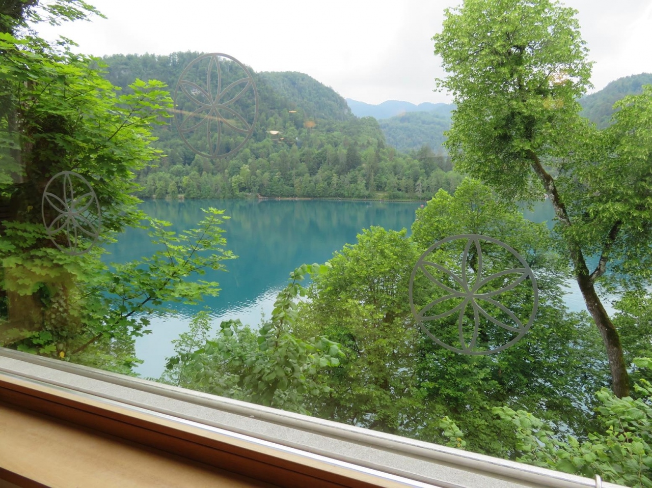 - 屋内席からは、ブレッド湖西岸がよく見えます。6月初めだと新緑がきれい。
