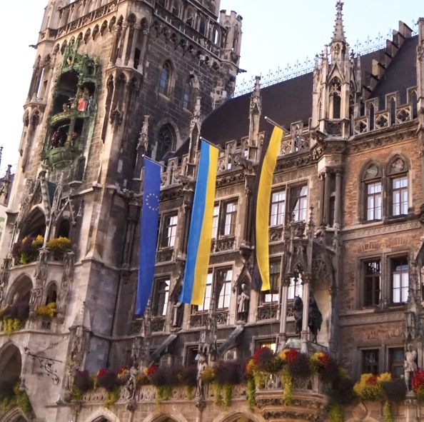 1つはEUの欧州旗 1つはウクライナの国旗 そしてもう一つは黄色と黒色の旗(調べたらミュンヘンの旗だそうです)