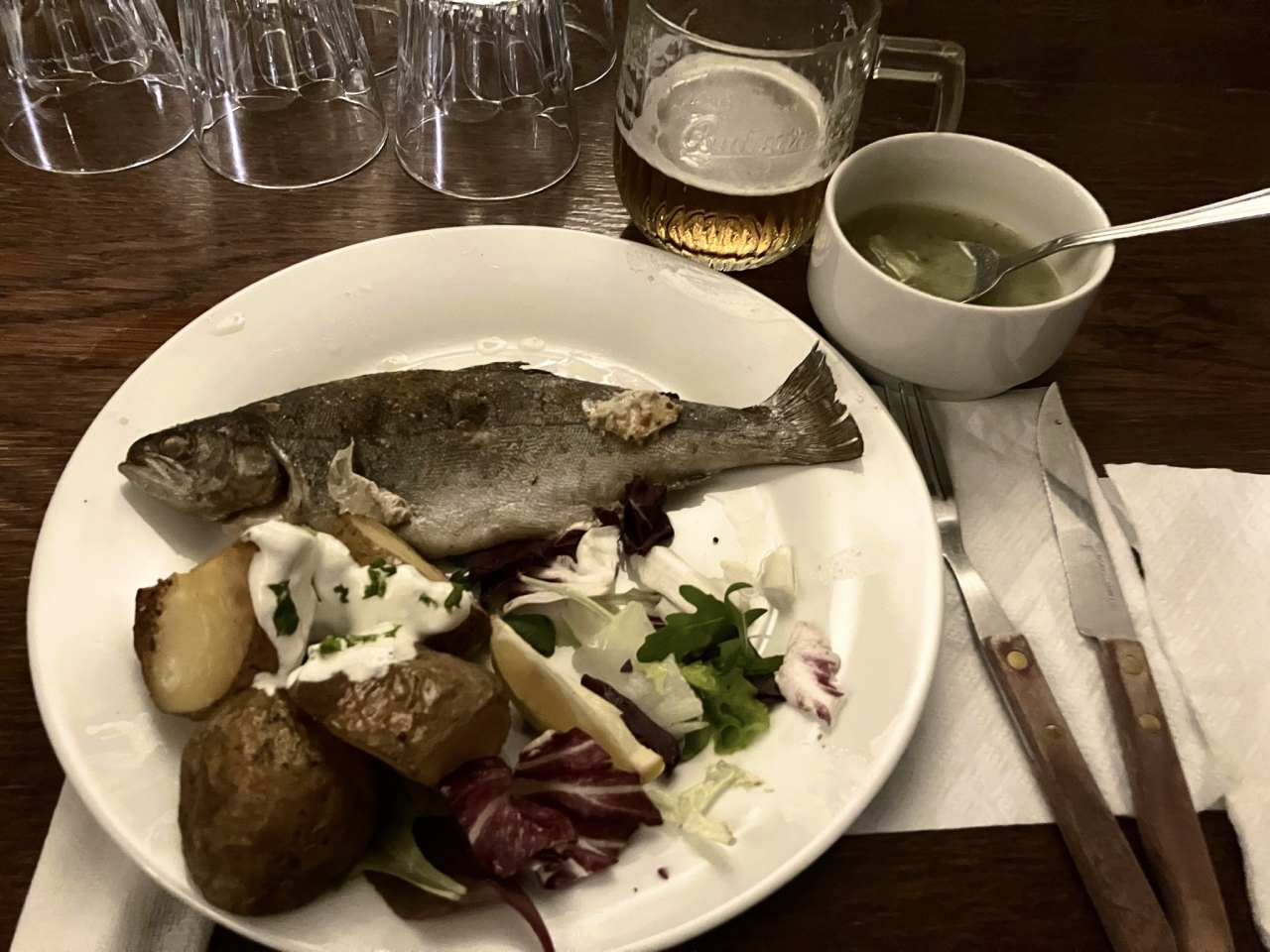 エイチアイエスのツアーの夕食に組み込まれていました。具沢山のスープとますのグリルとデザートにケーキを食べました。チェスキー・クルムロフの中心広場のスヴォルノステイ広場に面していて雰囲気のあるレストランでした。