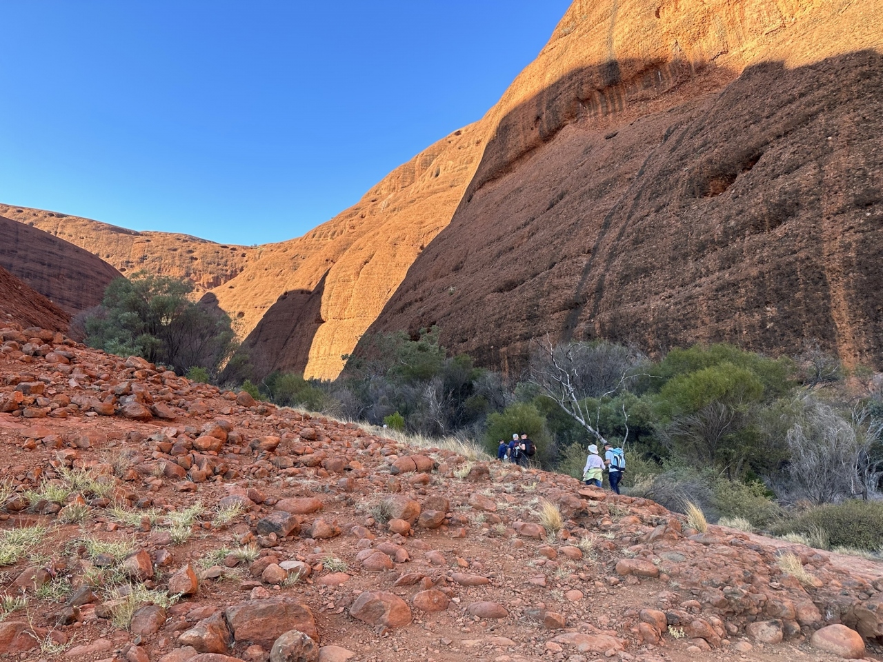 ウルルは2019年10月に登山が禁止となり、今では周辺から眺めるだけの存在になっています。それに対してカタジュタは、岩の間を縫って歩くようにトレッキングコースが整備されていて、ところどころで岩の上を歩いたり、登ったりすることができます。カタジュタは、ウルルに比べると行くための手段も限られていますが、ウルルよりもその壮大さを身近に感じることができます。