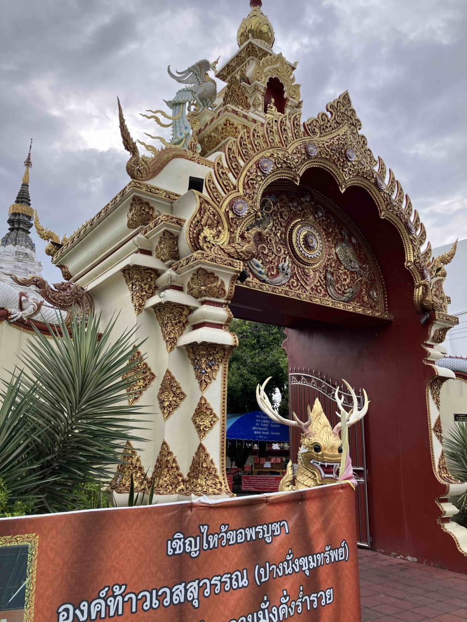 チェンマイの有名なお寺のワット チェディルアンを訪れた後に、近くのお寺巡りをしました。ワット チェディルアンの前の大きな通りを南に歩いて行くとありました。豪華な門を潜ると奥の方に白い見事な仏塔があります。その前にある本堂もなかなか立派でした。そんなに大きなお寺ではありませんが、ワット チェディルアンに行かれるなら足を伸ばしても良いと思います。