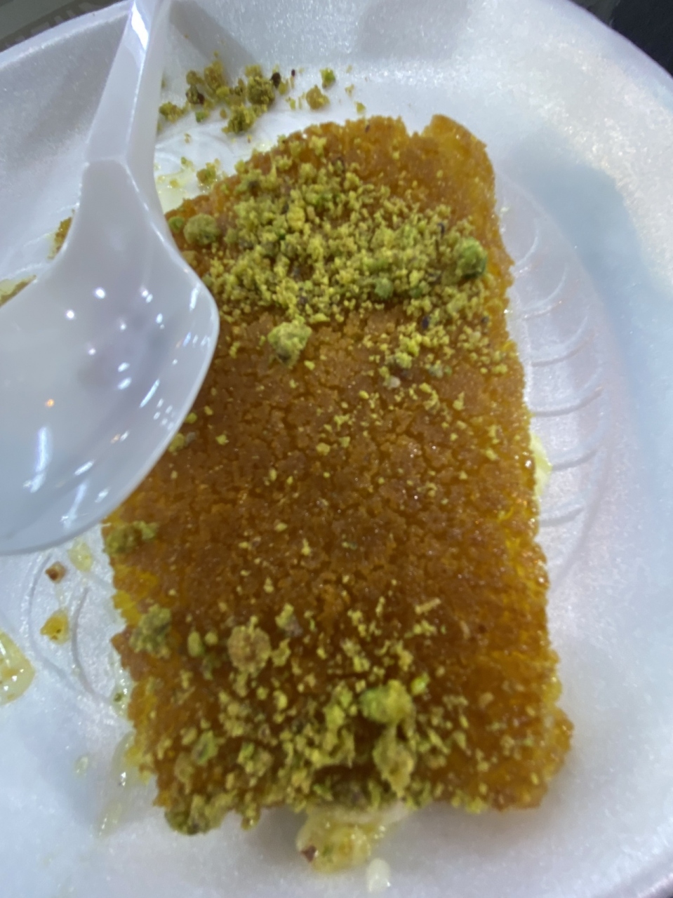 アンマン滞在中は、夕食後のデザートで毎回行きました。クナーフェの有名店で、店の前にはごみ箱があり、店の前で食べる人も多かったです。クナーフェは、カマンベールチーズのようなとろけたチーズの上に砕いたクッキーとビスタチオがトッピングされ、その上に甘いシロップがかかったお菓子です。チーズのしょっぱさとシロップの甘さのバランスが絶妙で美味しかったです。