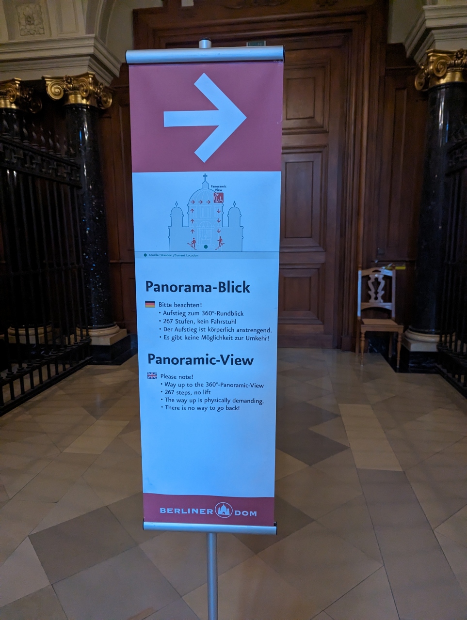 エントランスに行くと「カードのみ、キャッシュ不可」という案内が出ていて笑ってしまう(ここに限らずベルリンはほぼそうなんだけど、日本で寺院に行って参拝料がカードオンリーなようなものだから)。予約はせず、私が行ったときは券売機にスタッフがついて普通に入場券を買って入るシステムでした。