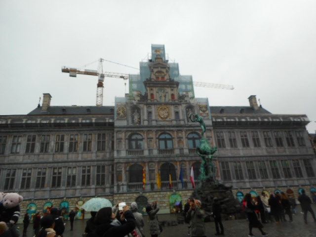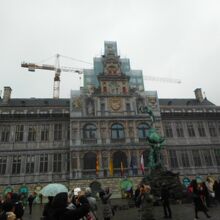 ギルドハウスにかこまれた広場で、豪華な建築物の市庁舎があり、アントワープの名の由来になった騎士フラボーが巨人アンチゴーヌの手を切り落としたという噴水が在りました。市庁舎はイタリアとフランドル・ルネッサンス様式の豪華な建物で観光の起点になっていました。