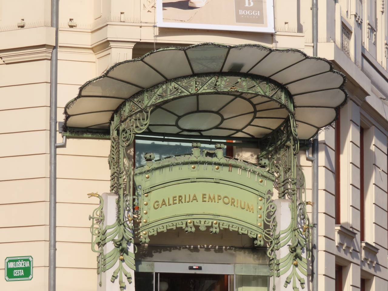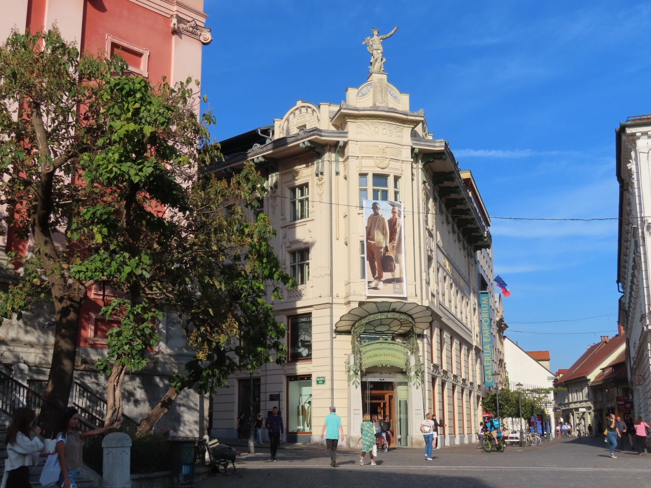 リュブリャナ三本橋新市街側の広場、一番目立つ赤い教会の右側にある美しい建物です。高級ブランド店が入っている商業施設のようですが、元は何だったのでしょうか。名のある建築に違いないと思います。てっぺんのエルメス像が有名なんだそうです。