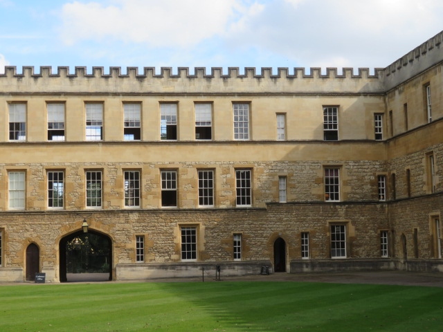 ラドクリフカメラの裏手の道を少し行った少しややこしい場所にあります。入場料は8ポンドです。ハリーポッターのロケ地になった場所で、魔法の学校の雰囲気が感じられます。芝生が敷き詰められた中庭は明るく、校舎も新しい雰囲気ですが、外側の校舎は古く、その対比が素敵なカレッジです。
