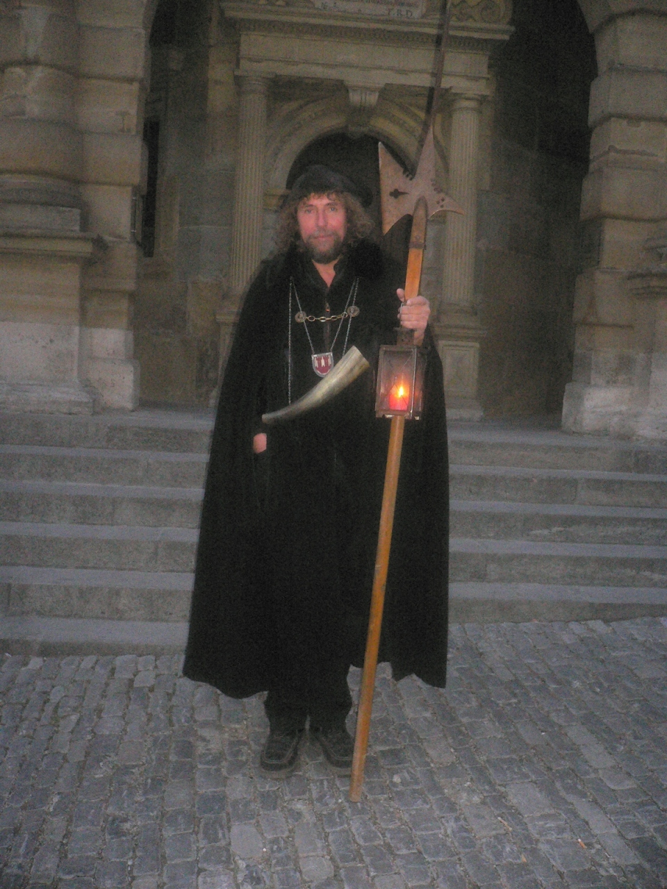 かって街の平和を守るために働いた夜回り番人が、現在は市庁舎前からツァーがあります。4月から12月の毎夜、暗くなった夜の観光ツァーが始まり、黒装束の番人の案内で町の名所巡りができる人気のツァーです。なかなかユニークでした。