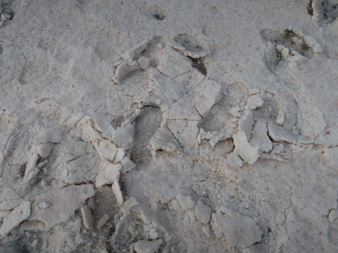 試しに岸辺から数メートル足を踏み入れて行ってみたところ、塩の下の地面はすっかり乾いているわけではなく、塩水がジュワジュワと染み出て来たり足がめり込んだり。