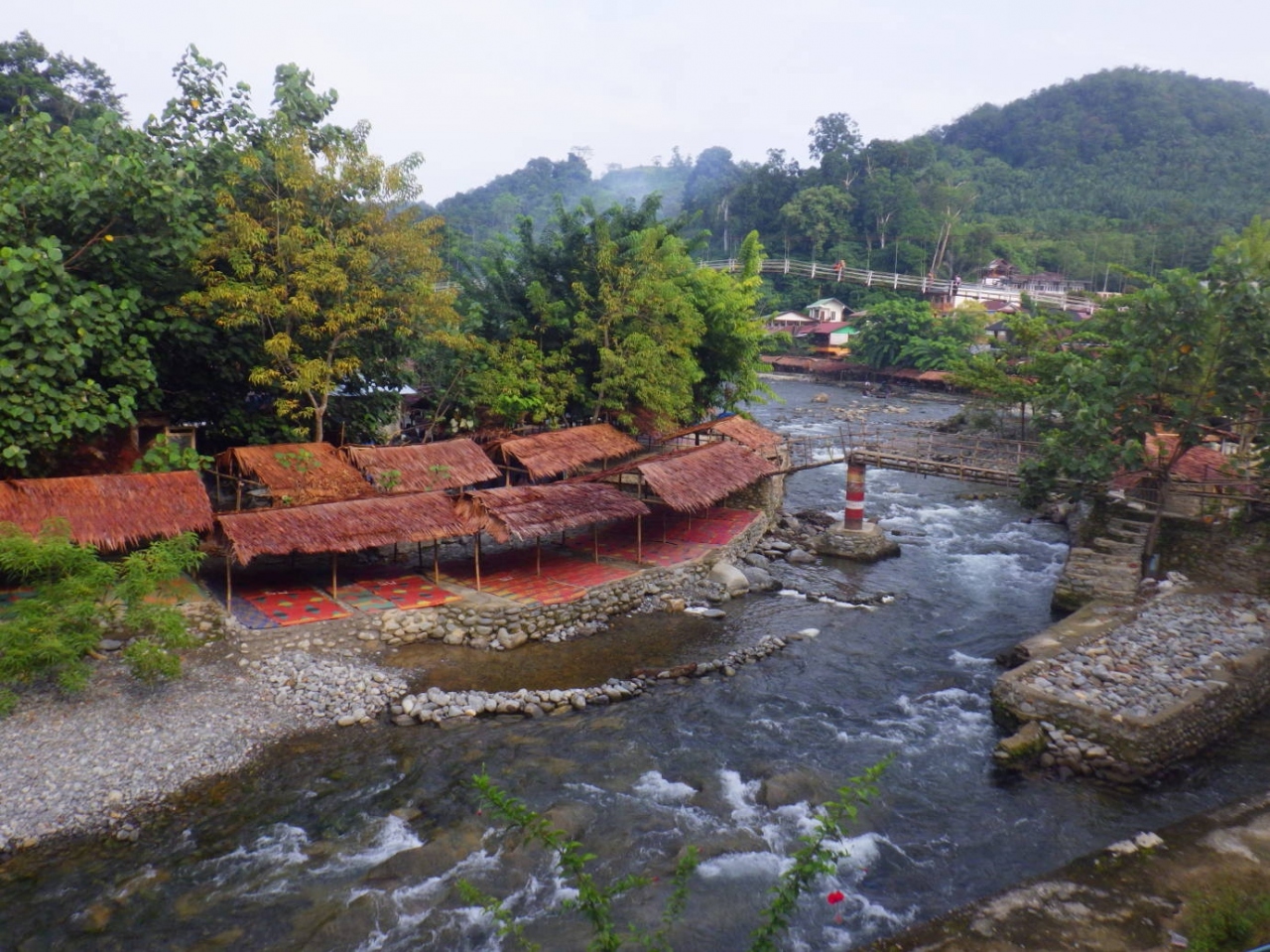 「PINANG_BARIS」で市バスを降りると、すぐに人がやってきて「ブキッ ラワン」行きのバスに連れていかれました。看板に「メダン-ブキラワン25千ルピア」と書いてある気がしたので、値段を聞くと「1人100千ルピア」と言われました。高いと思ったので、「30千ルピア」と言うと、すぐに「30千ルピア」になりました。やはり定価は「1人25千ルピア」のようでした。バスは3時間半ほどで「ブキラワン」のバスターミナルに着きました。バスを降りると客引きのような人が登場しましたが、まずは振り切ってターミナル周辺を散策しました。ブキラワンにATMは無いという話でしたが、バスターミナル近くのコンビニ「Indomaret」にはATMがありました。バスターミナルにいた客引きの人が目指していたゲストハウス「Ustin Nagoya」の人と電話を繋いで、ベチャでゲストハウスまで送ってくれました。