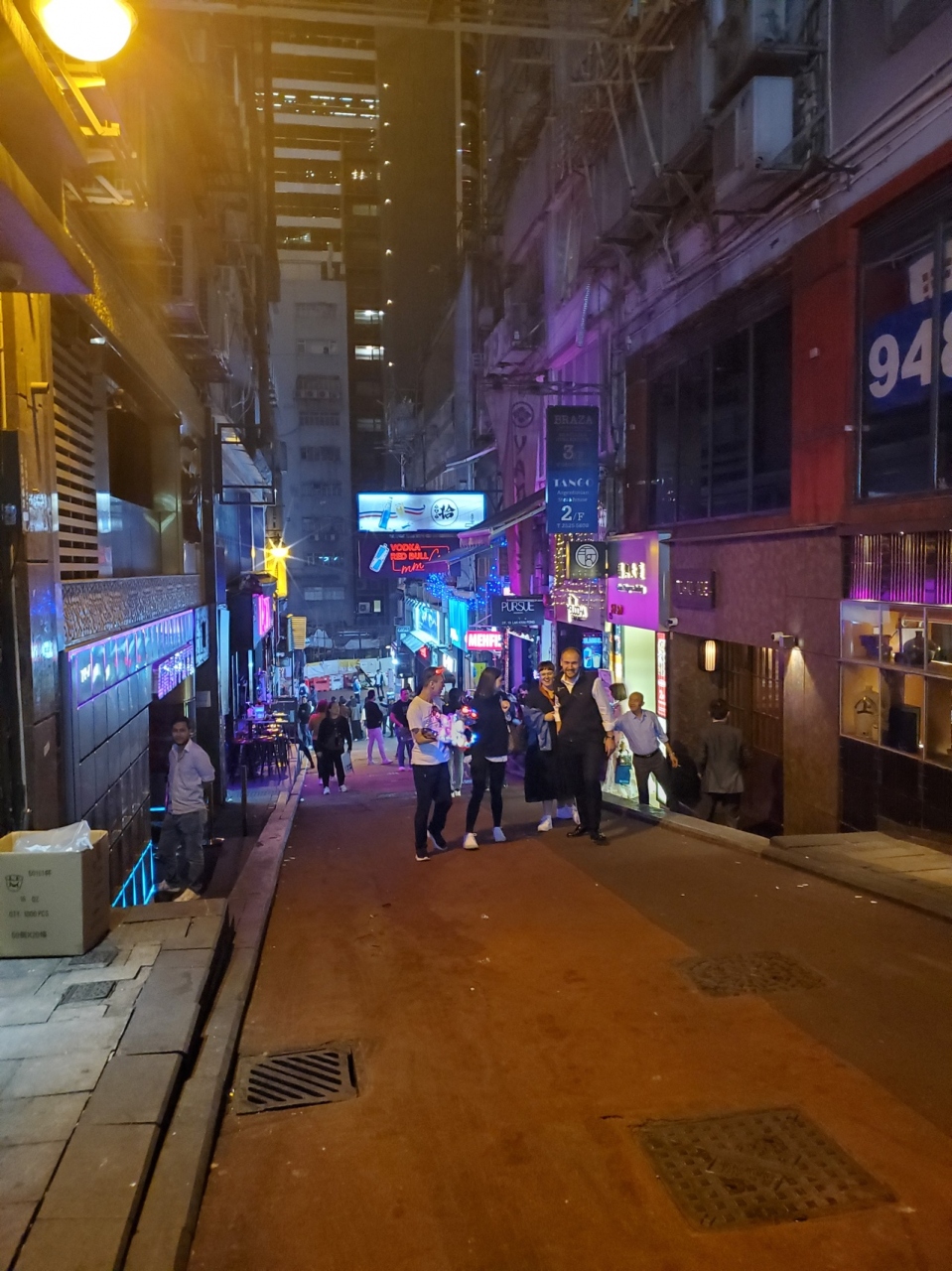 香港のナイトスポットのひとつ、飲食店、クラブなどがひしめきあうエリアで金曜日の夜にフラット散策したらかなりの人がいました、治安もまあ大丈夫そう。アジアの夜市とかそういった雰囲気ではなく日本の飲み屋が立ち並ぶ町だとかに似た雰囲気です。