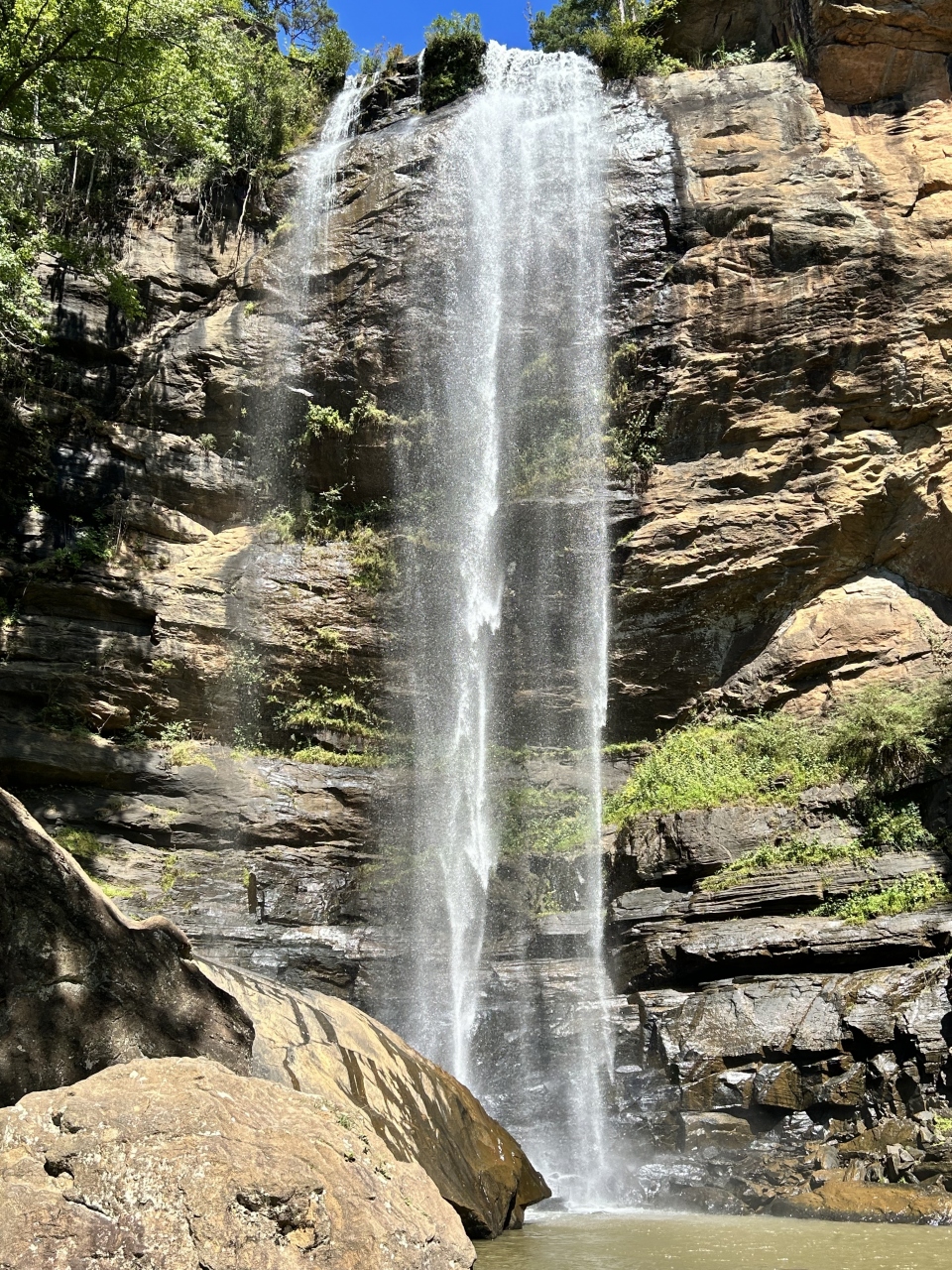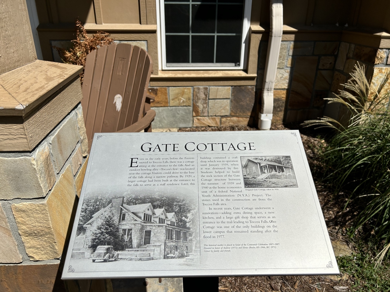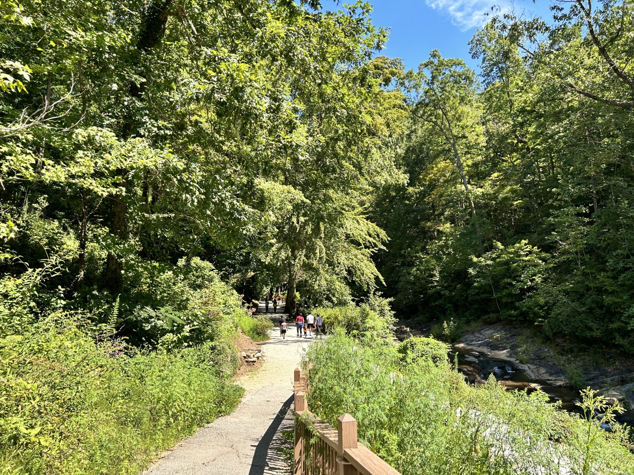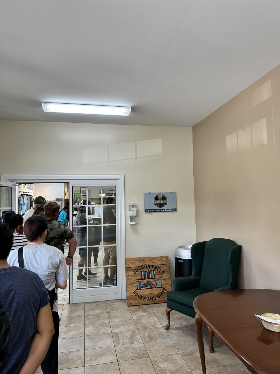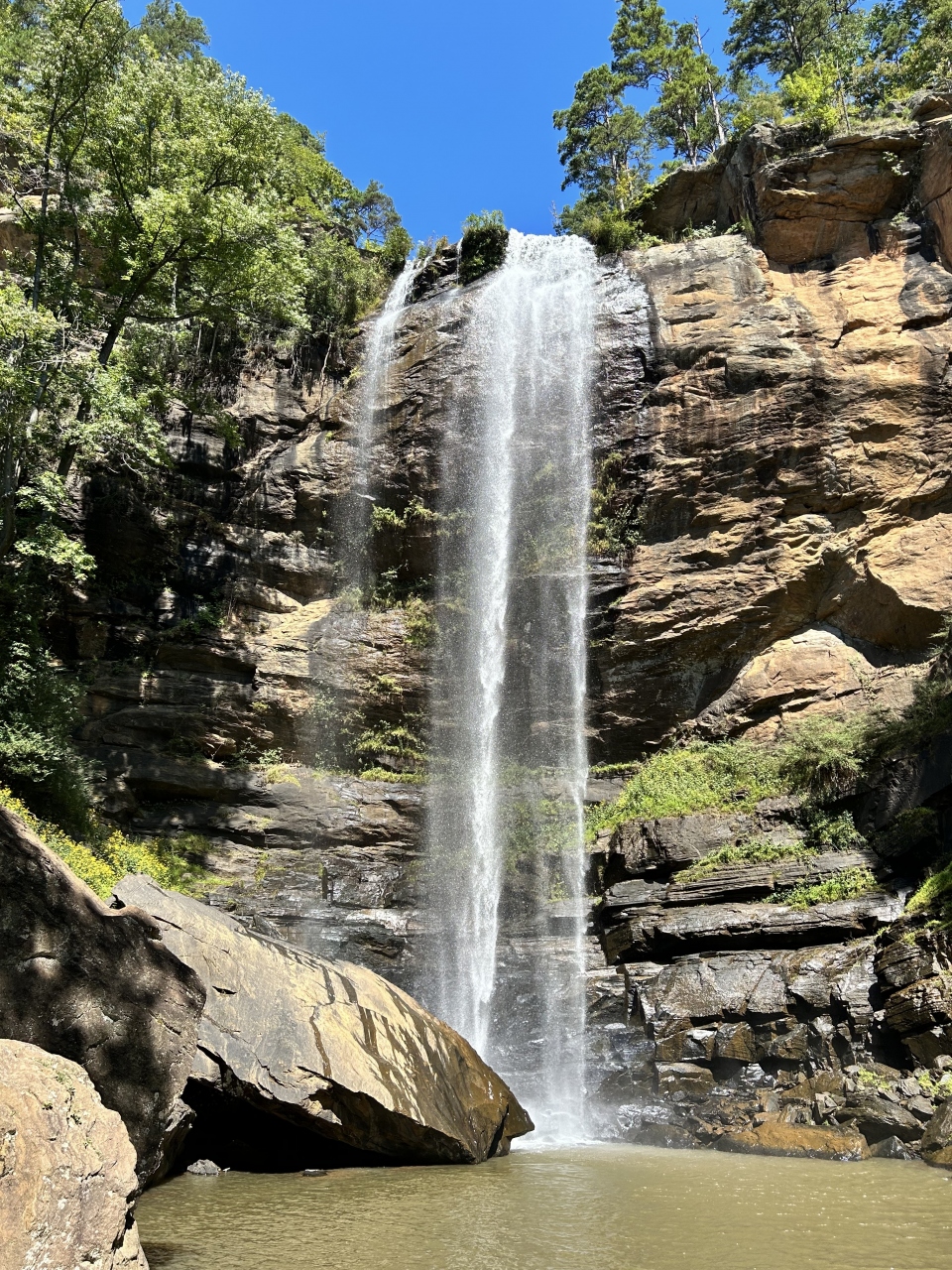 「トコア・フォールズ大学」の構内(自由に入れます)にあるビジターセンターから滝の遊歩道に入ります。土/日曜日は12時オープンでした(平日は10時)。12時まであと5分...早く来すぎなくてよかった。ギフトショップが入場口で、ここで入場料を払います。遊歩道へ出て、川沿いの遊歩道を少し歩くと滝に辿り着きます。落差57mで真っすぐに落ちる絹の様な美しい滝でした。