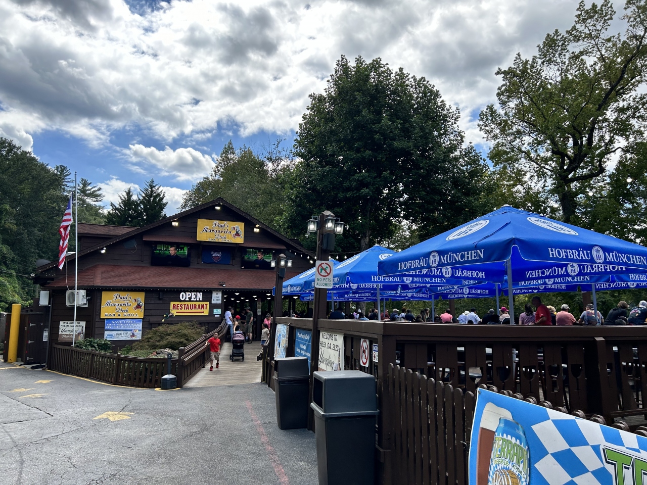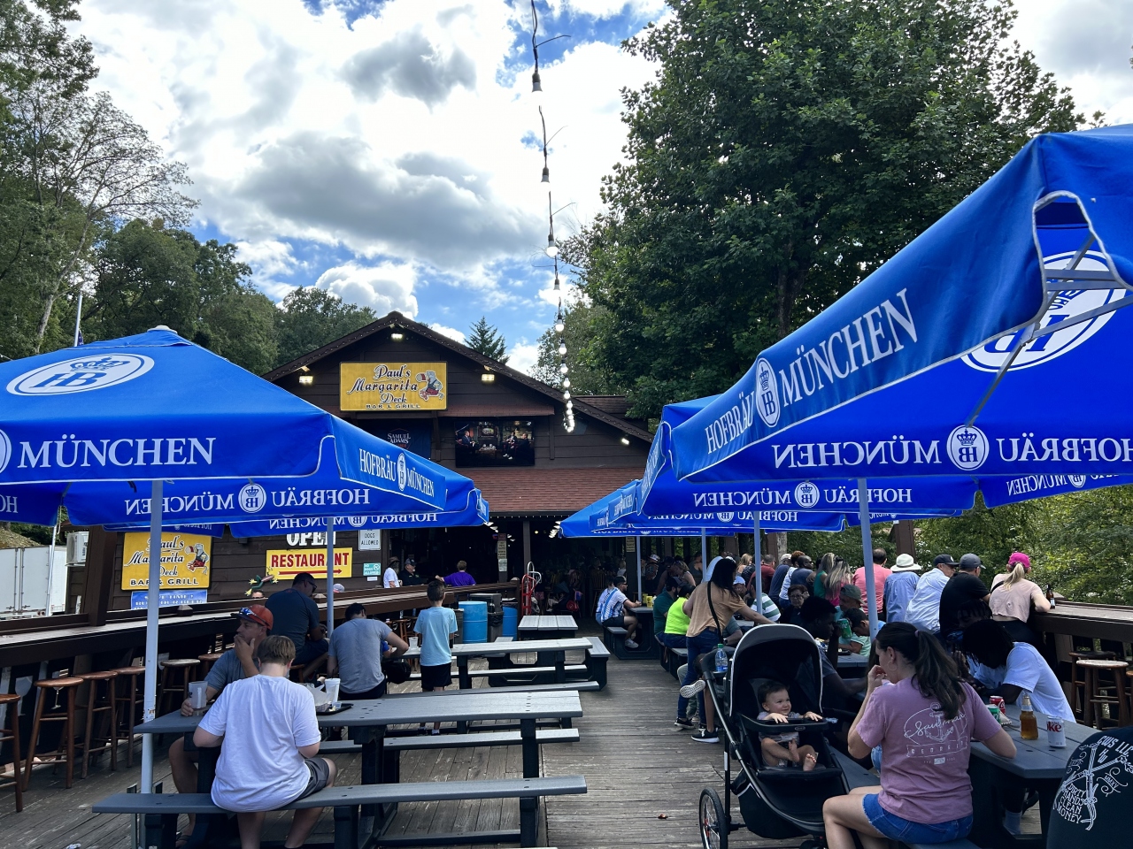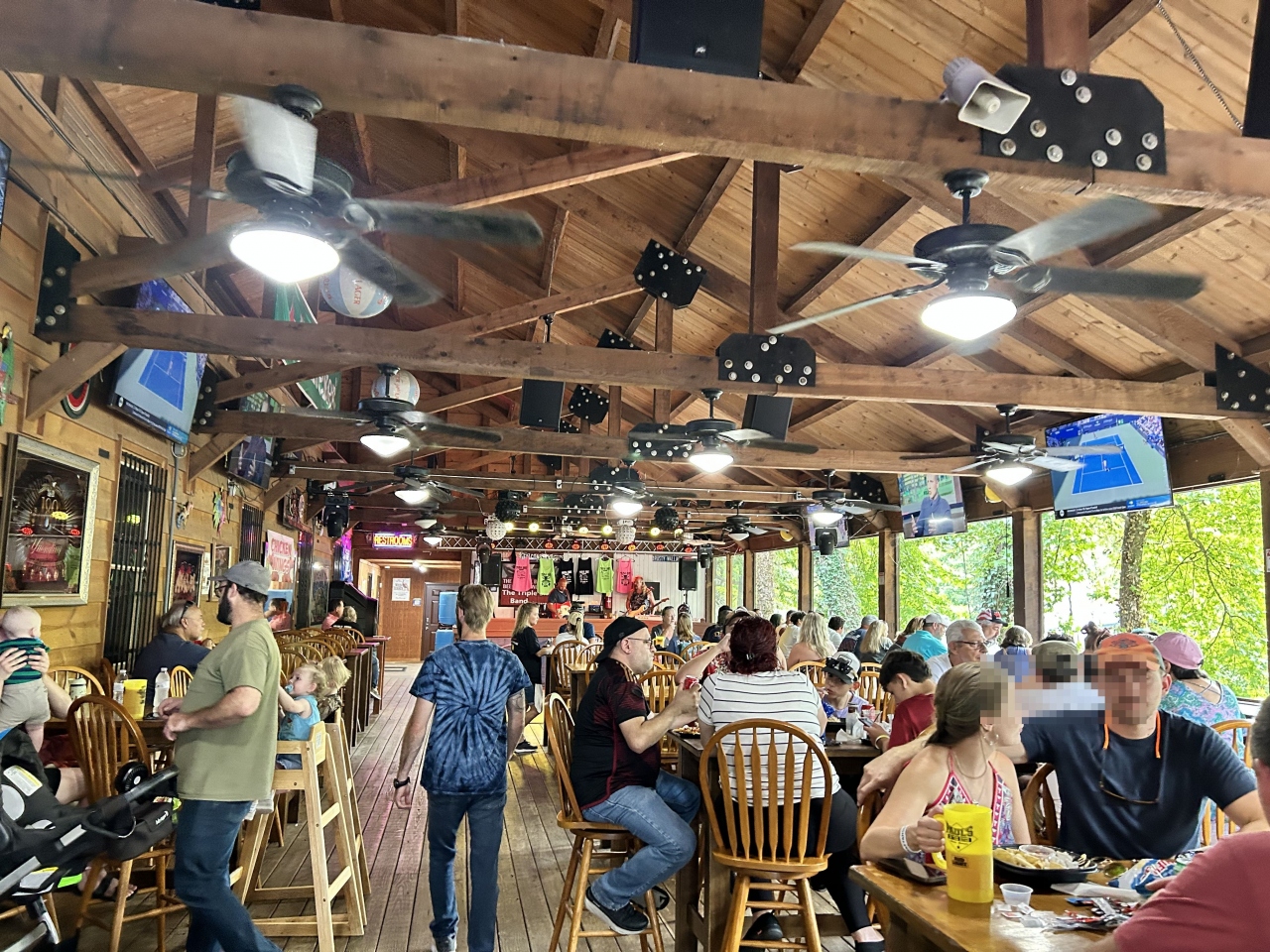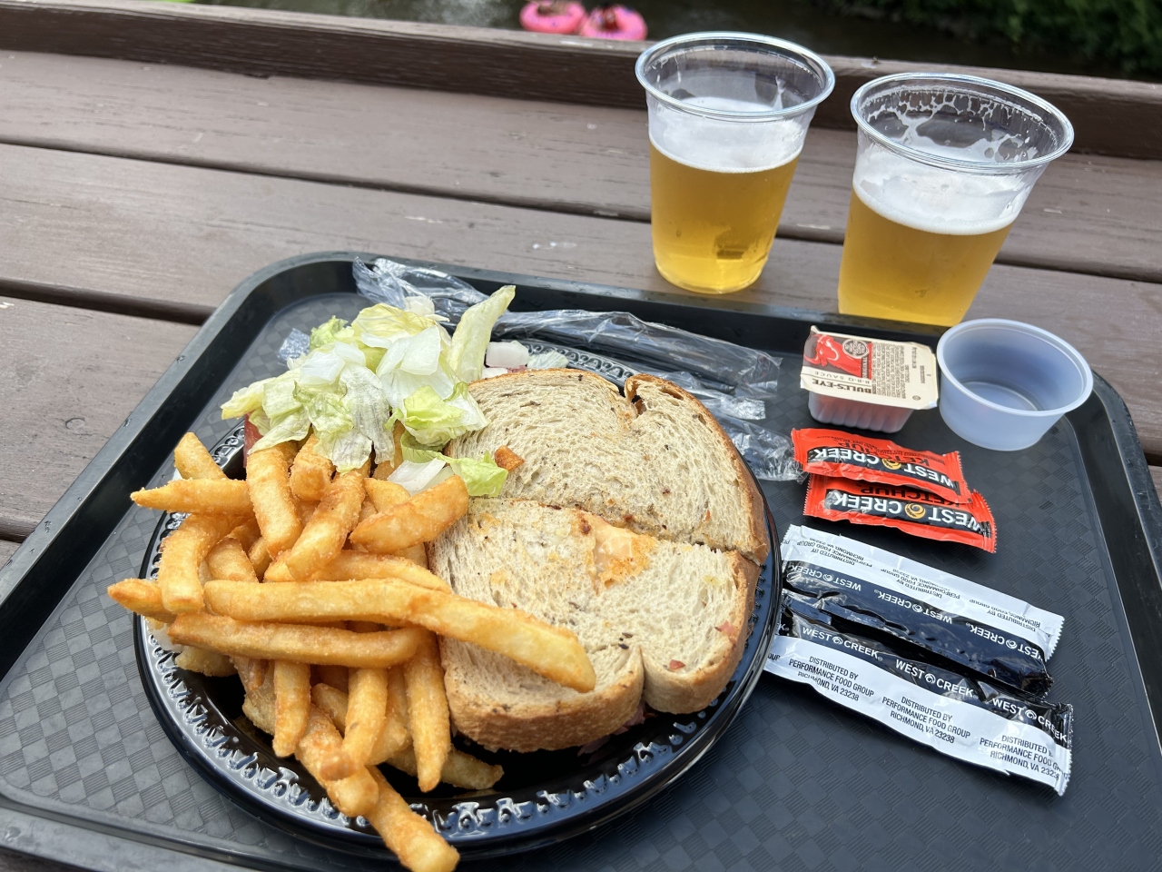 チャタフーチー川を望む人気のレストランです。気軽なファストフードっぽいレストランで、ライブ演奏で盛り上がり中でした。ビールとフードをゲットしにカウンターへ。ビールは「ヴァルシュタイナー(Warsteiner)」をチョイス。フードは、”BASKETS”というメニューカテゴリーの中の一番上にある「REUBEN」をチョイス。「REUBEN」とはルーベン・サンドのことで、ライ麦パンのトーストにコンビーフかパストラミビーフ、スイスチーズ、ザワークラウトを挟んだアメリカ生まれのサンドイッチ。ここではパストラミビーフかターキーが選べました。生演奏を聴きチュービングで流れてくる人々を眺めながら美味いビールが楽しめる、良い雰囲気のレストランです。
