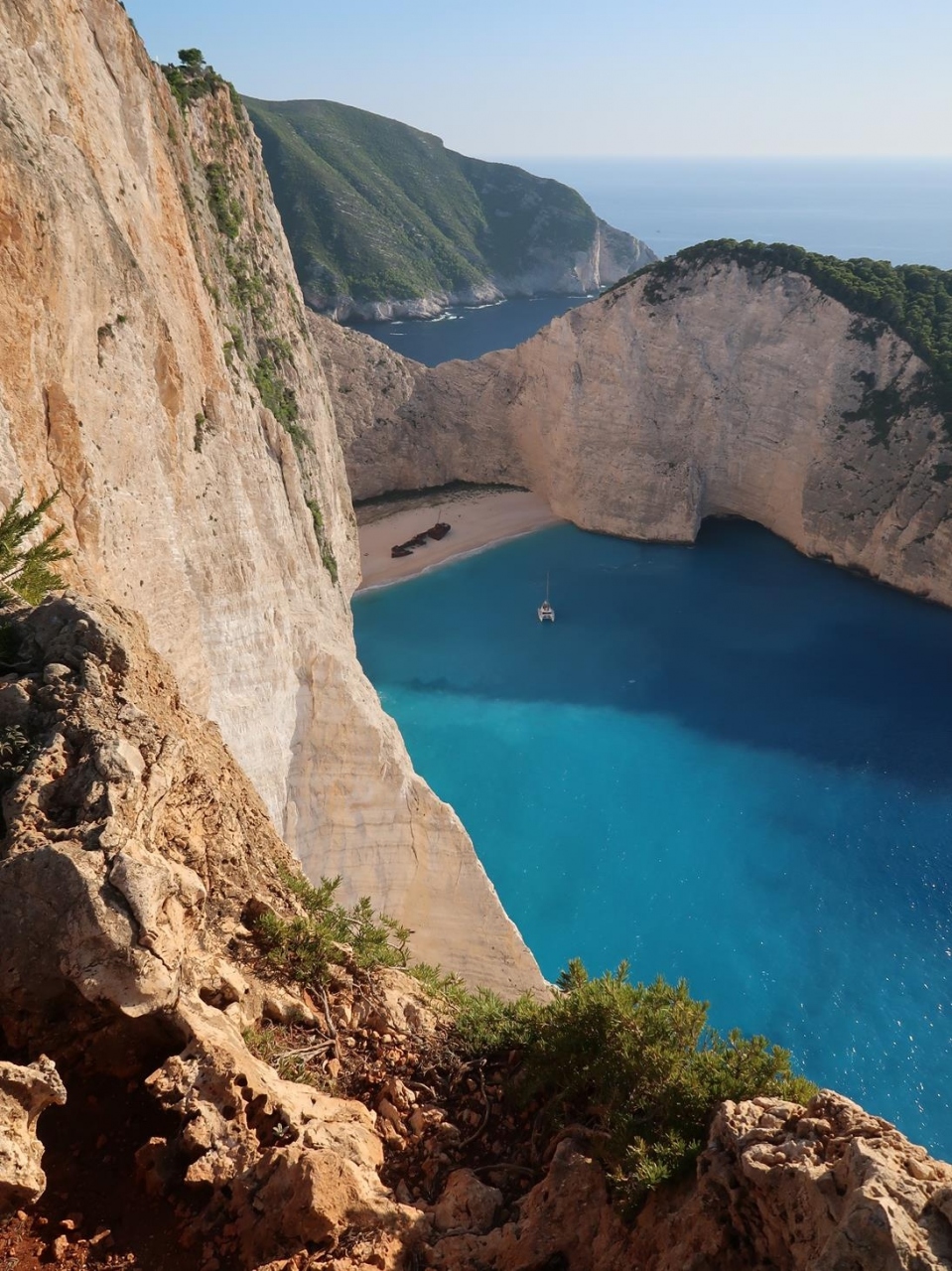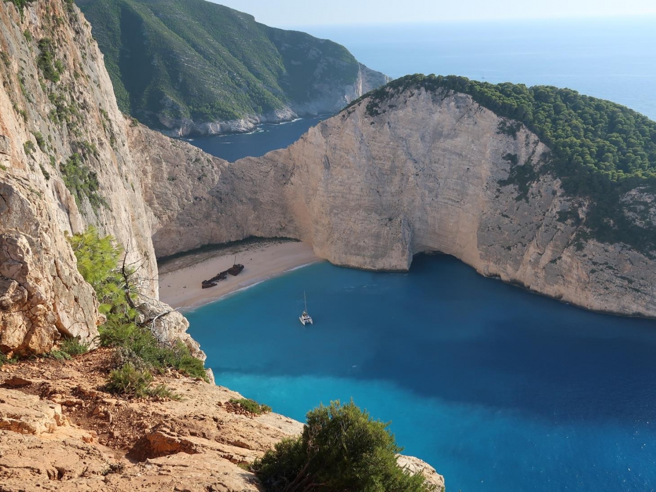 ザキントス島北西部にあるシップレック・ビーチ(ナバギオ・ビーチ)は、断崖絶壁の下にある白砂ビーチで、その名の通り難破船が砂浜に横たわっているのがいい風情。
