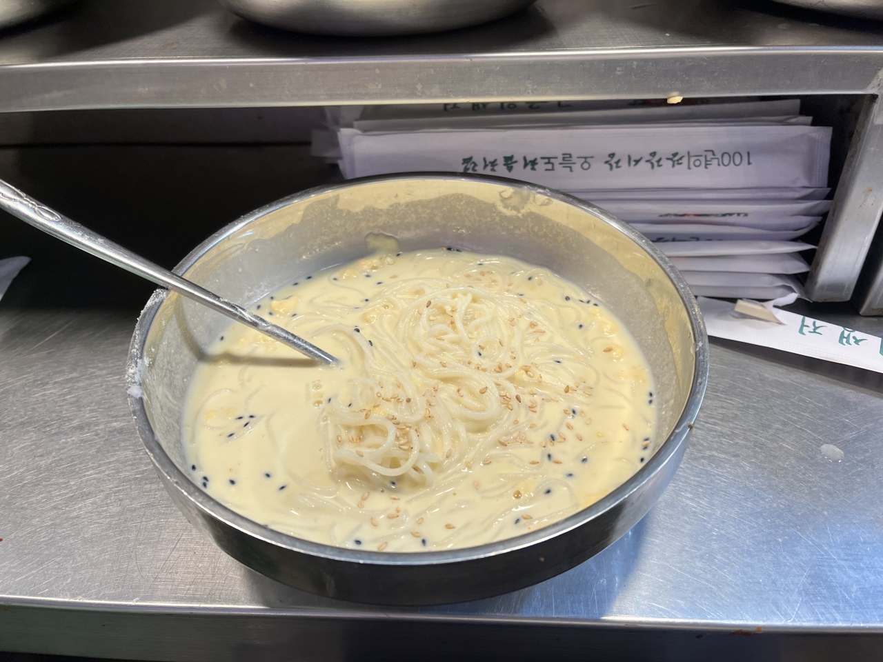屋台で豆乳麺を食べてきました。出てきた時には見た目が美味しくなさそうでがっかりでしたが味は辛くないけれど、そこそこに汁が濃くて美味しかったです。豆乳の味だけではなくごま油のような気がしました、豆乳が入っているのですごくマイルドでした。
