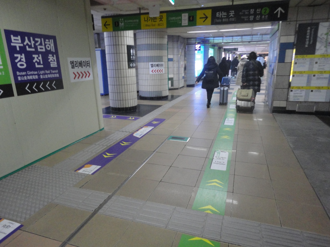 空港へ伸びる釜山金海軽電鉄と釜山地下鉄の2つの駅があります。金海軽電鉄は高架、地下鉄は地下ですので、乗り換えには少し時間が掛かりますが、通路には案内があるので迷いませんでした。ただ、地下鉄の改札はトランクを持ちながらですと通りにくいバーを下ろすタイプなので、改札で苦戦している人を何人も見かけました。