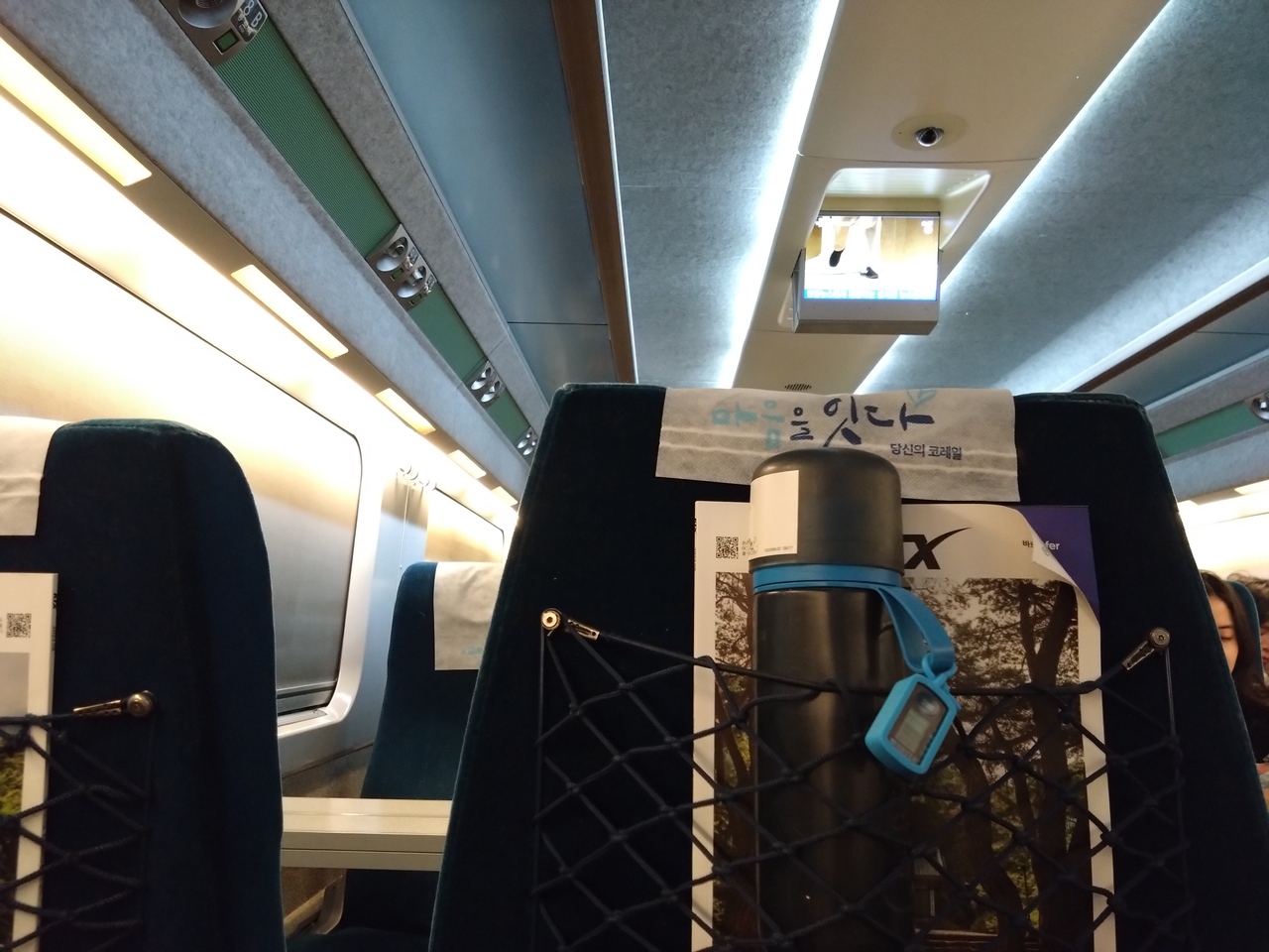 車両中央の席は向かい合って4人がけになっていて、広いテーブルもあります。TVモニターがあるのもKTXならでは?