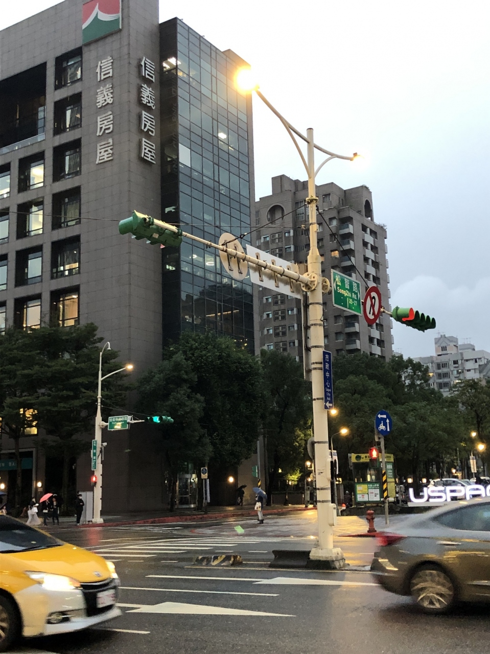 午後から夜までこの通り付近に滞在したので、景色が変わっていく様子を楽しみました。夕日が台北101に反射してオレンジ色に輝いていました。台北101やショッピングモールや会社のビルなどが立ち並んでイルミネーションも綺麗でした