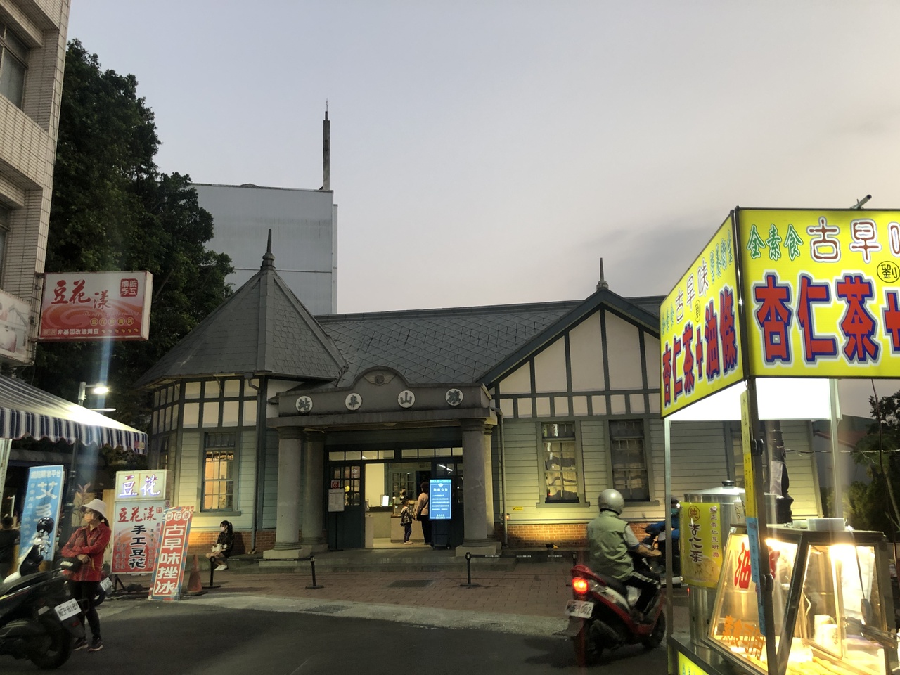 妻とバイクで来ました。バイクは駅舎の斜め向かいに、他のバイクと一緒に停めました。駅舎自体は今は故事館になっていました。この駅舎だけでなく、老街全体に日本統治時代に流行ったバロック風の建物が並んでいました。