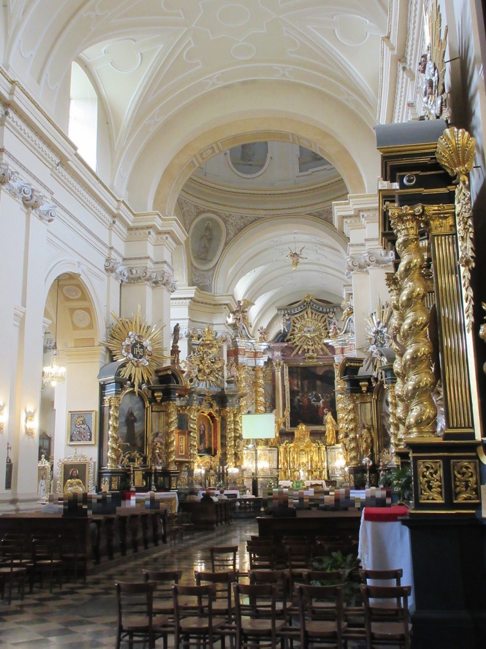 【クラクフ旧市街】のはずれ、【ヴァヴェル城】を右にて南東方向に坂を下った先にある【聖ベルナルト】教会まで足を伸ばしました。教会前には広い敷地があり、2本の尖塔を持つ教会は、内部の天井も非常に高く、渦巻き状の円柱もあってバロック風の装飾が取り入れられていました。ただ、全体としては白漆喰の壁で、金を使った壁面装飾は控えめで落ち着いた雰囲気でした。また、敬虔なカトリック教徒の多いポーランドらしく、祈りをささげる信徒がミサに参加していました。