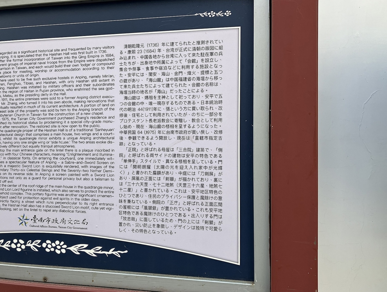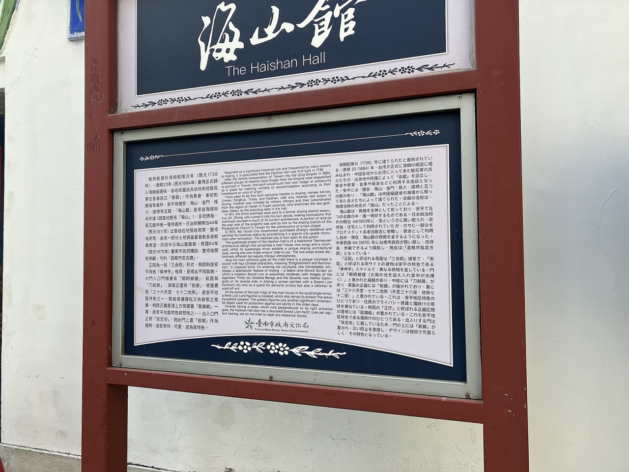安平老街とよばれる一角、效忠街を散策していたら目を引く白い壁がありました。その白い壁面上部には青瓦の屋根という美しさ。解説版には「海山館」とあり、日本語も併記されていましたが、それによると建てられたのは1736年、清国時代に台湾に派遣された兵士たちが、その出身地毎に設立した会館の一つであり、安平に建てられた5つの会館のうち、こちら「海山館」は福建省の海壇(当時の名称が海山)から渡ってきた兵士たちによって建てられたとありました。アジア各地、中国人が住む街には必ず会館があります。日本で言ったら県人会や県民会館に相当するものですね。美しい壁の向こうにも魅力的な建物の屋根が見えましたが、扉は閉ざされていました。後で調べたら訪れた月曜日は休館日で、普段は見学できるとのこと。次回は必ず訪れたいと思いました。
