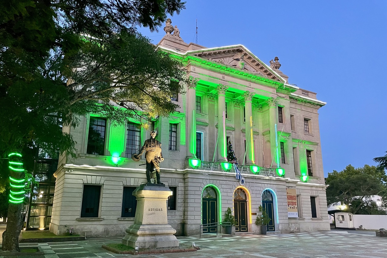 スペインとポルトガルのスタイルが入り混じった世界遺産の町コロニアは、歴史を感じさせる路地と石畳がポイントですが、ランドマークになる建物は、この州政府の建物と教会くらいでしょうか。お役所なので建物の中に入って観光というわけにはいきませんが、美しい建築で写真に収めがいがあります。クリスマスの時期に訪れたので夜にはライトアップされていました。