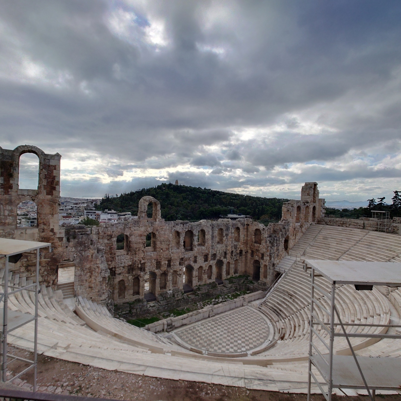 アクロポリスの斜面にある半円形の音楽劇場遺跡です。パルテノン神殿と一緒にライトアップされていて夜は綺麗でした。近くに行ってみると座席が綺麗に整備されていました。現在でも公演で使われているとのことで、納得です。
