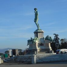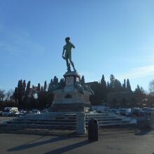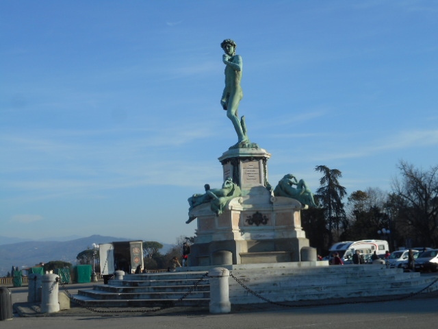 徒歩で約20分くらいで、アルノ川を流れる橋を渡り小高い丘の上のミケランジェロ広場に行きました。フィレンツェの街並みが望めるビューポイントでした。広場中央にミケランジェロ作のダヴィテ像がありました。これはレプリカです。