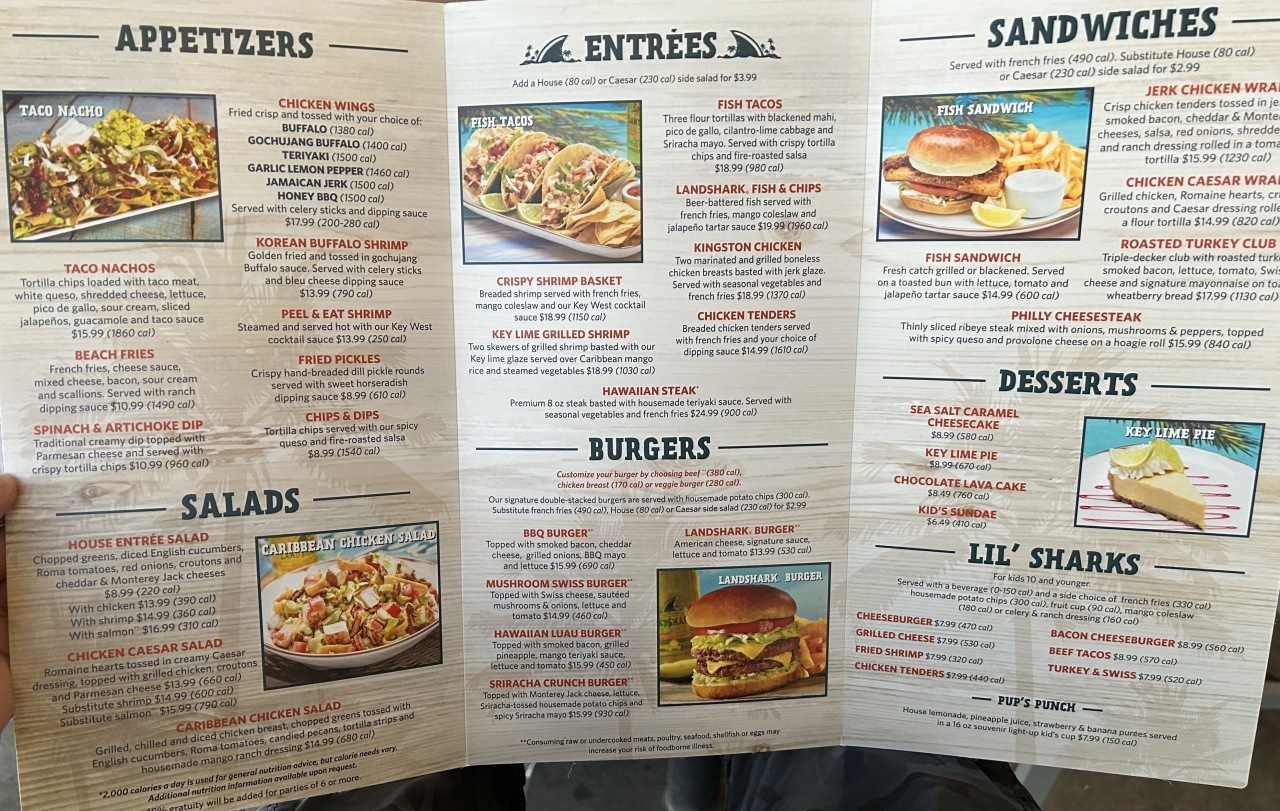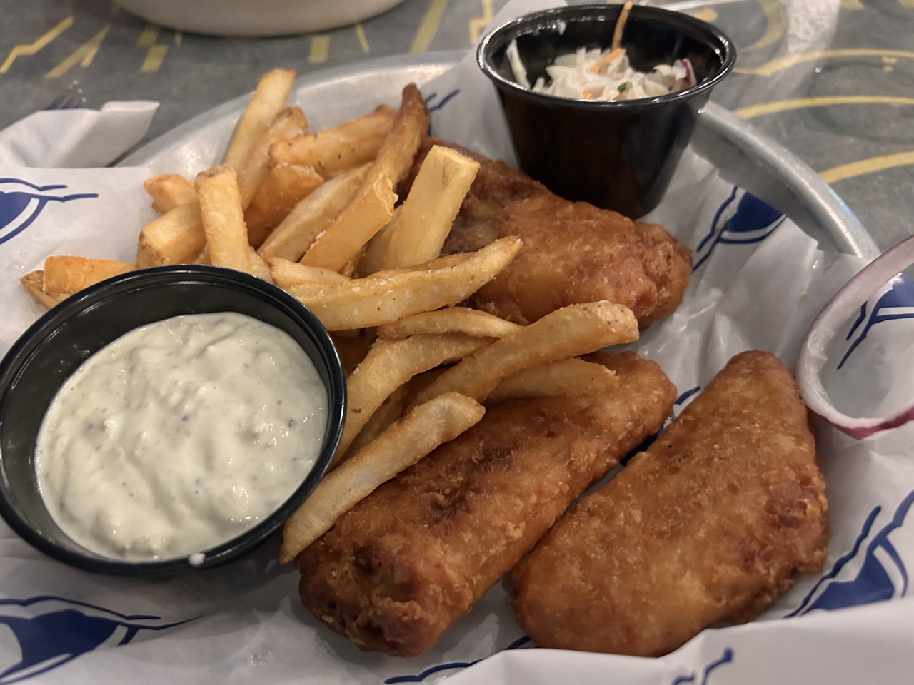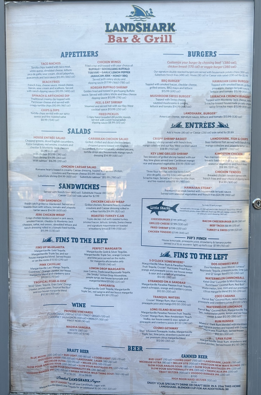 ビーチサイドのレストランでディナーしながら花火を見るのが良いかなと思い席を取りました。すぐには席の空きがありませんでしたので少し待ってから着席。頼んだわけではないのですが、ちょうど花火が見えそうなテラス席に案内してくれました。まずはビール、そして「ハウス・アントレ・サラダ(HOUSE ENTRÉE SALAD)」および「ランドシャーク・フィッシュ&チップス(LANDSHARK FISH & CHIPS)」をオーダーし、これらをつまみながら花火鑑賞。料理は普通でしたが花火鑑賞に絶好のレストランでした。
